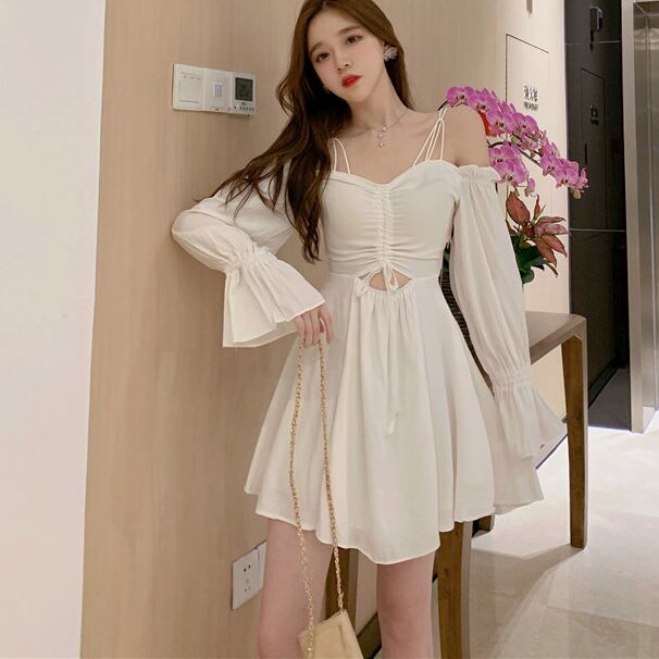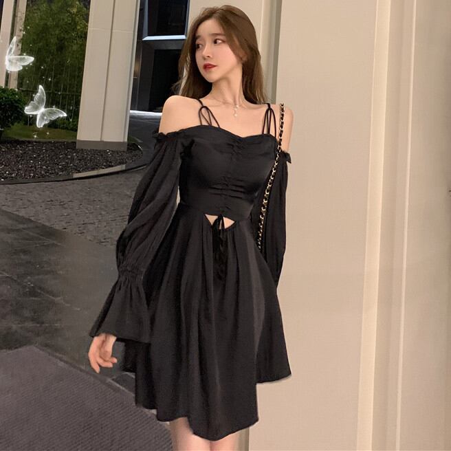全2色 オープンショルダーワンピース シャーリング Vネック ハイウエスト Aライン 長袖 ボリュームスリーブ ワンピ ショート丈 ミニ丈 可愛い 大人可愛い レディース ガーリー フェミニン キュート お出かけ 通勤 買い物 デート 女子会 春