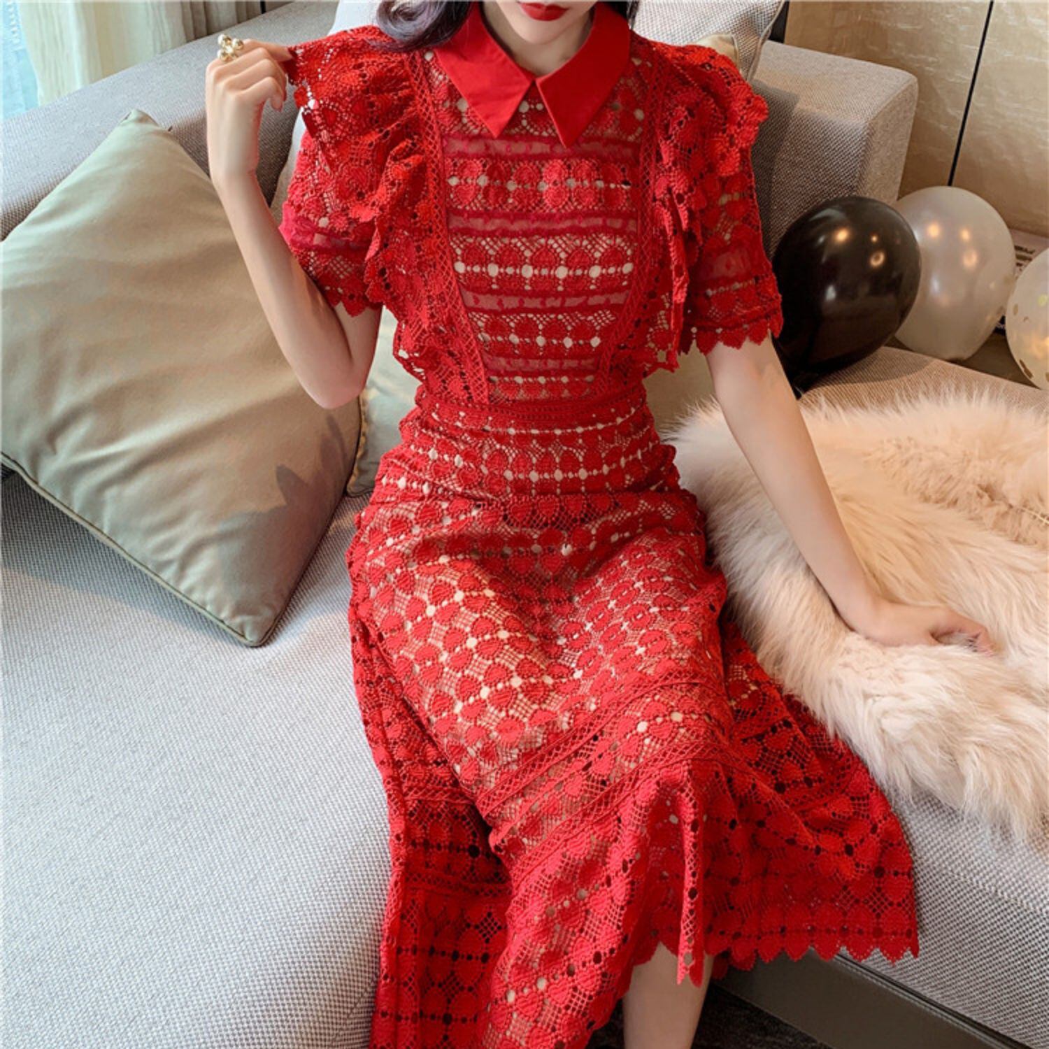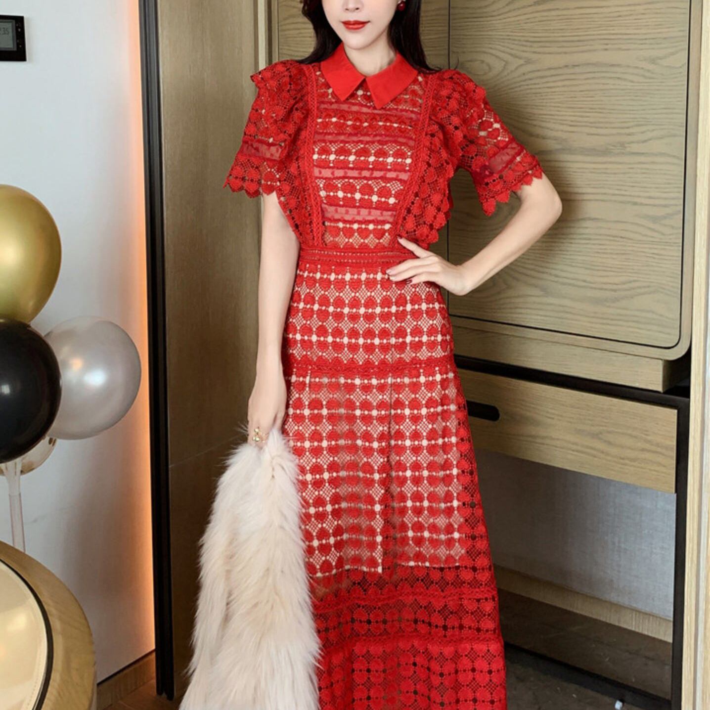 ハート 刺繍 総レース ワンピース 襟付き ハイウエスト Aライン 半袖 フリル袖 ラッフル ワンピ ロング丈 可愛い 大人可愛い レディース ガーリー レトロ フェミニン キュート 上品 お出かけ パーティー 買い物 デート 夏