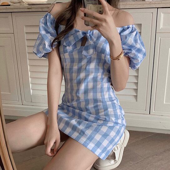 ギンガム チェック柄 オフショル ワンピース 胸元リボン 切り替え パフスリーブ ハイウエスト Aライン 半袖 ワンピ ショート丈 可愛い 大人可愛い レディース ガーリー レトロ フェミニン キュート 清楚 お出かけ 通勤 買い物 デート 女子会 夏