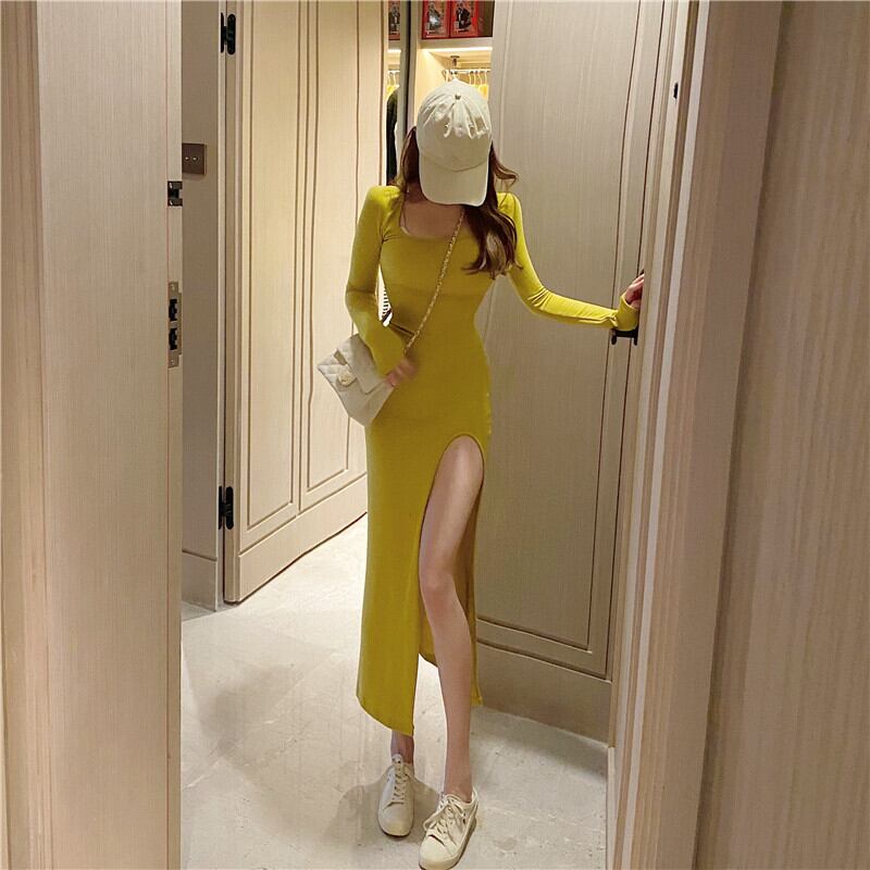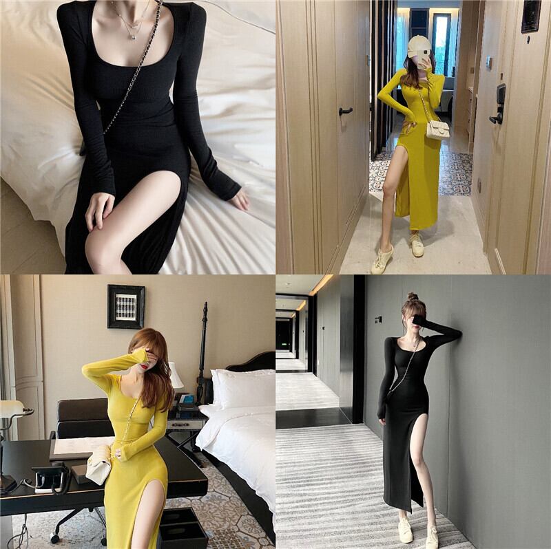 全2色 ワンピース ロング ワンピ Uネック スリット 長袖 ロングスリーブ タイト 無地 シンプル スリム 春 夏 秋 デート レジャー 大人 カワイイ カジュアル