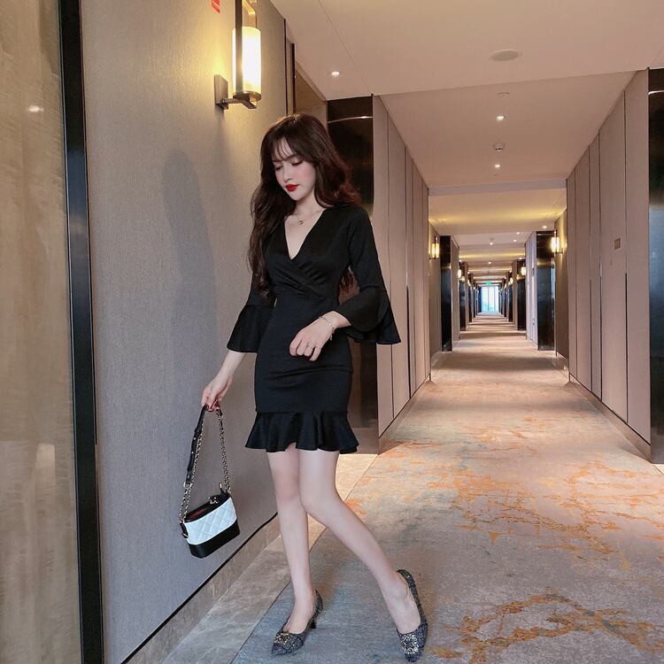 全2色 ワンピース ミニワンピ フレア Vネック フリル タイト 長袖 ロングスリーブ 無地 シンプル チューリップスカート カシュクール カワイイ 大人 レディース パーティー お呼ばれ 女子会 春 夏 秋