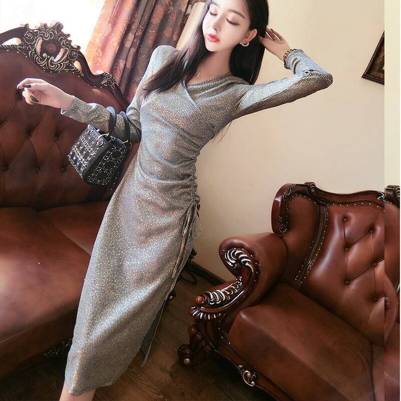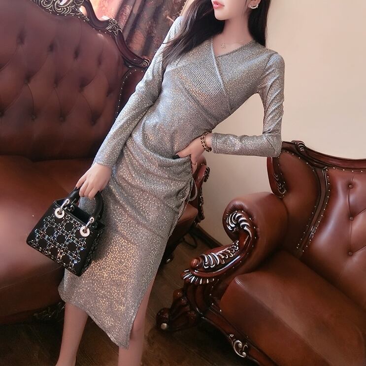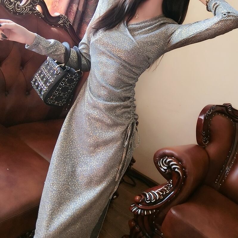 カシュクール ワンピース 紐 Vネック シャーリング タイト ミモレ丈 長袖 ロングスリーブ スリム シンプル ドレープ グレー 春 秋 オシャレ レディース 大人 エレガント 上品 かわいい