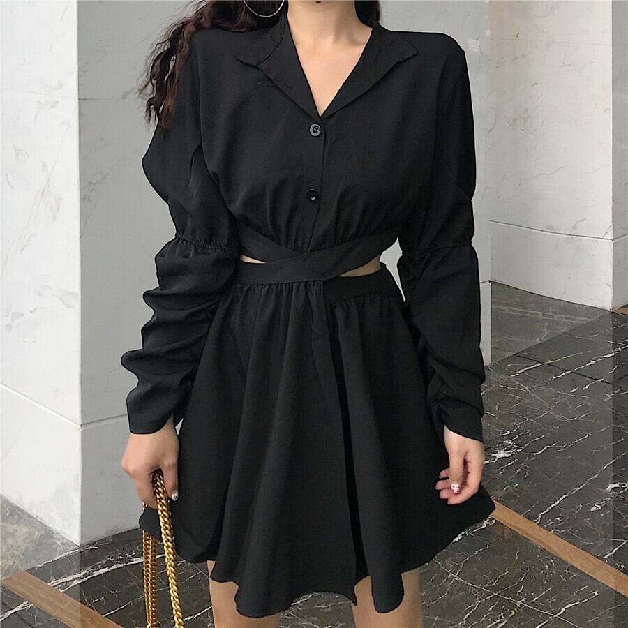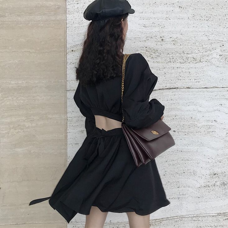 バックコンシャス シャツワンピース 肌見せ クロスデザイン Vネック バックリボン フロントボタン ハイウエスト Aライン ボリューム袖 長袖 ワンピ ショート丈 可愛い 大人可愛い レディース きれいめ クール セクシー カジュアル 上品 お出かけ 通勤 買い物 デート 女子会 春