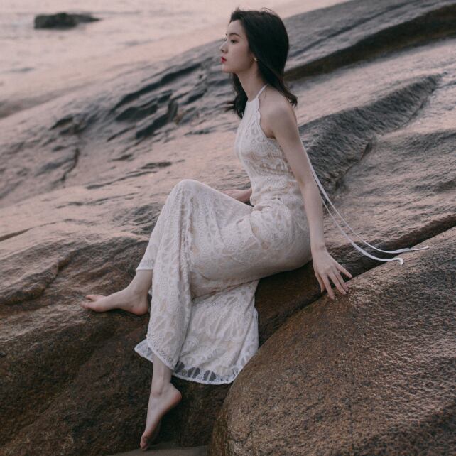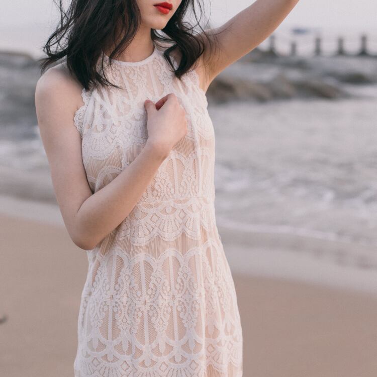 総レース ホルターネック ワンピース バックコンシャス フリル襟 フレア Vネック ハイウエスト Aライン 長袖 ワンピ ロング丈 可愛い 大人可愛い レディース セクシー エレガント フェミニン キュート 上品 お出かけ 旅行 リゾート 買い物 デート 女子会 夏