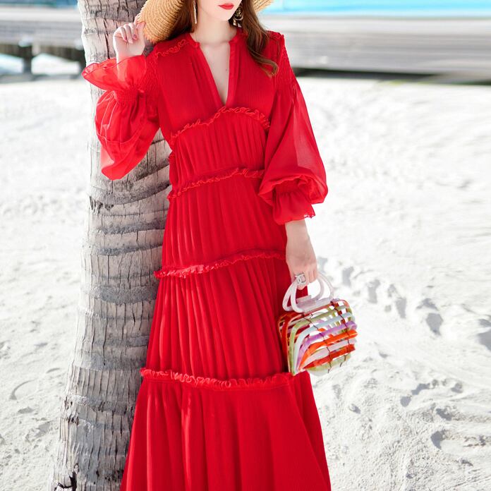 シフォンワンピース ティアード フリル フレア Vネック ハイウエスト Aライン 長袖 ボリューム袖 ワンピ マキシ丈 可愛い 大人可愛い レディース レトロ フェミニン エレガント 上品 お出かけ 買い物 リゾート 旅行 デート 女子会 春 夏