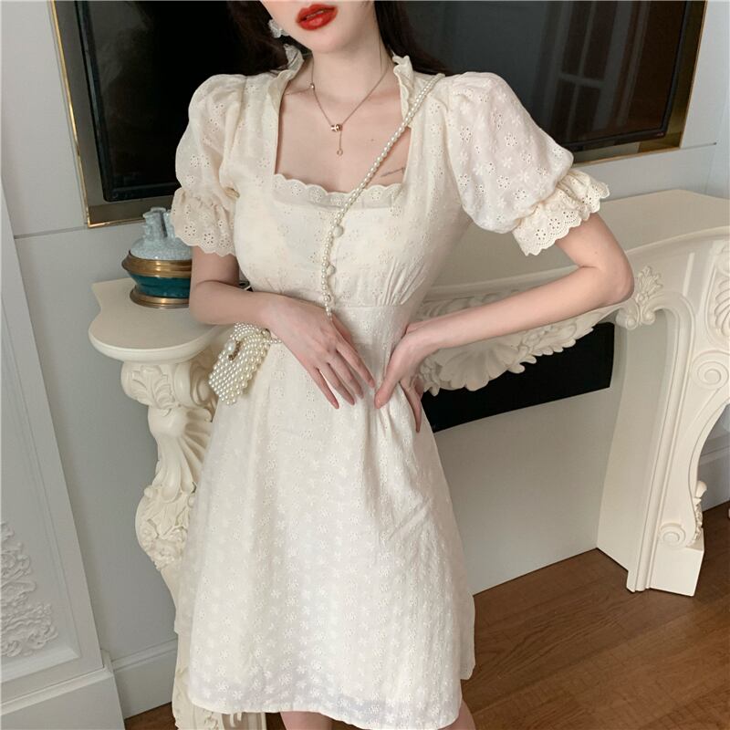 全2色 ワンピース スクエアカラー ワンピ 膝丈 フリル ランタンスリーブ 半袖 ジャガード レース ハイウエスト ボタン Aライン ナチュラル レトロ カワイイ 上品 ガーリー レディース クラシック クラシカル 春 夏