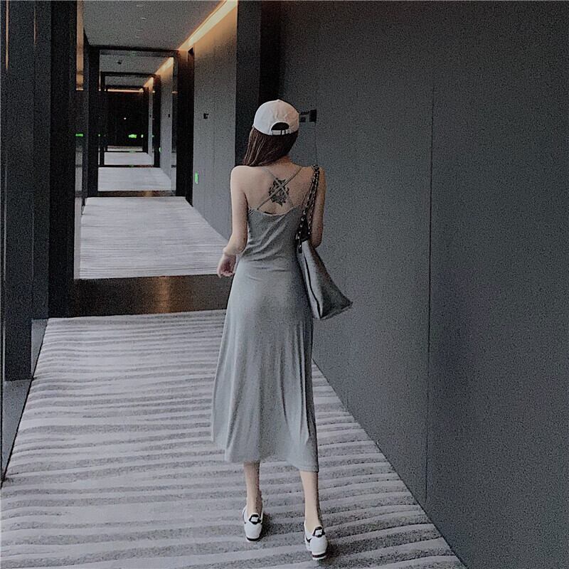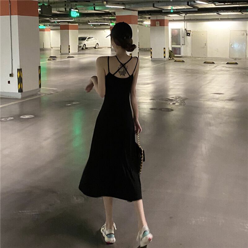 背中開きのセクシーなキャミワンピはVネック仕様で背中がクロススリングになっています。
