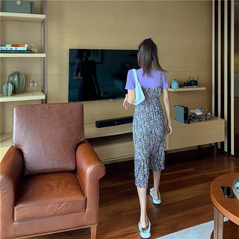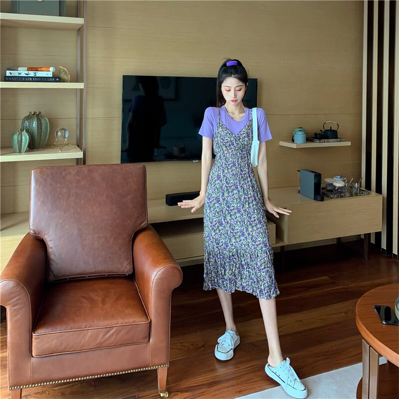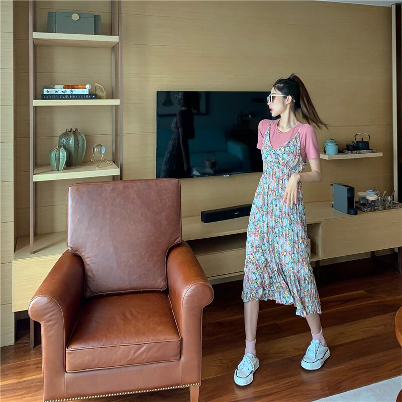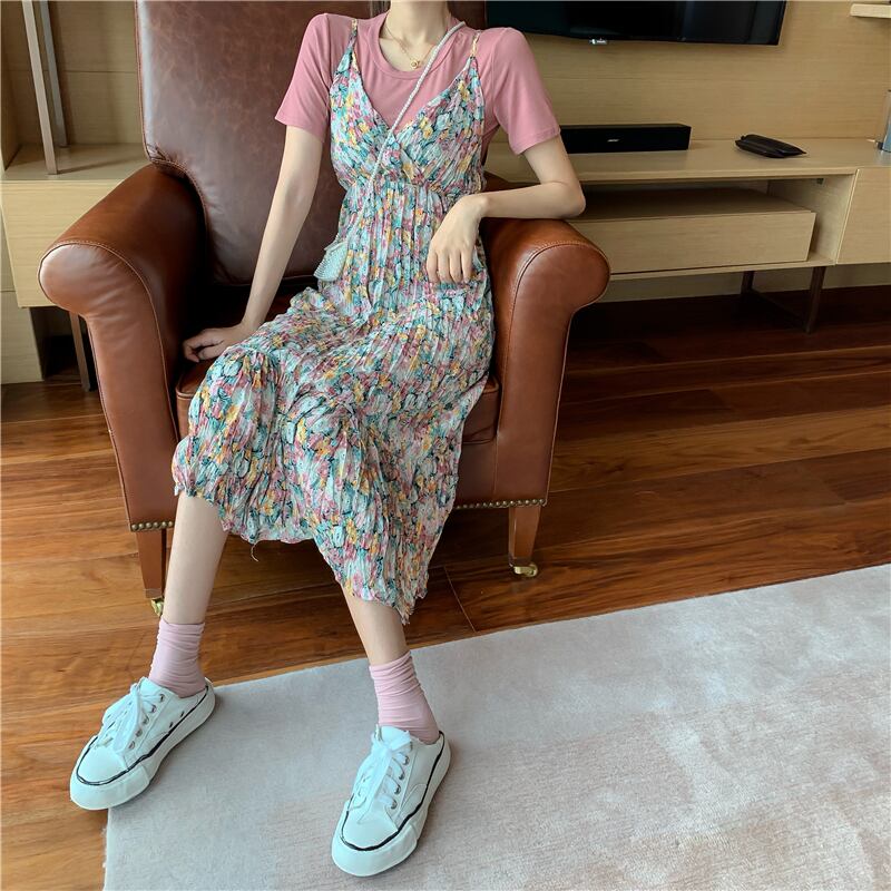 全3色 ワンピース 花柄 キャミワンピ ミディ丈 膝下 フリル Vネック プリーツ カジュアル フローラル カワイイ 大人 おしゃれ レトロ 上品 ミディ シフォン 春 夏 秋