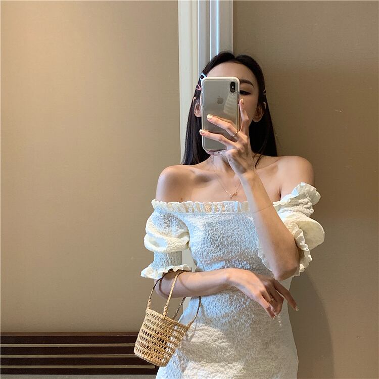 オフショルワンピース フリル ミニワンピ 無地 シャーリング シンプル 半袖 セクシー シワ加工 大人 レディース カワイイ ストラップレス 旅行 リゾート 女子会 春 夏 ホワイト 白