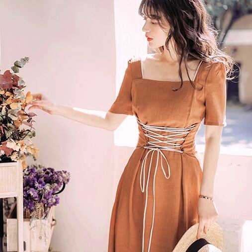 ワンピース 半袖 スクエアカラー 無地 シンプル レースアップ ウエストリボン 紐 ミディ丈 カワイイ オシャレ レトロ 大人 上品 エレガント クラシカル クラシック 旅行 女子会 パーティー リゾート 高見え