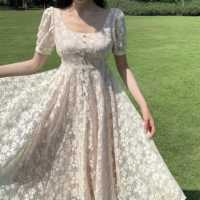 全2種 レース ワンピース ミニワンピ ミディ丈 ランタンスリーブ スクエアカラー バックジップ ボタン 花柄 フラワー 清楚 純粋 カワイイ ガーリー 上品 エレガント レディース 大人 春 夏 秋