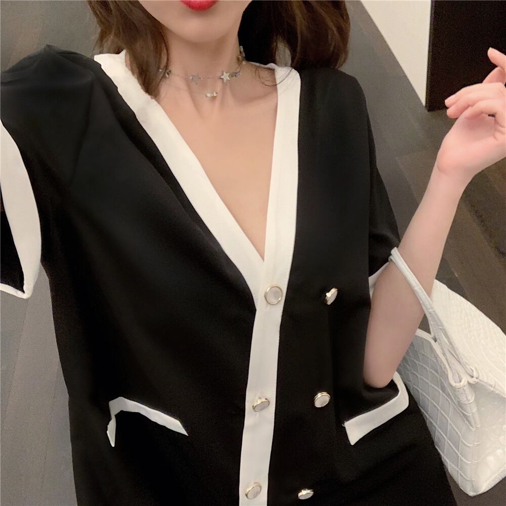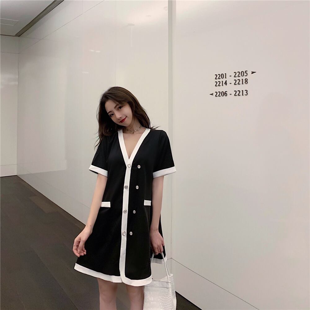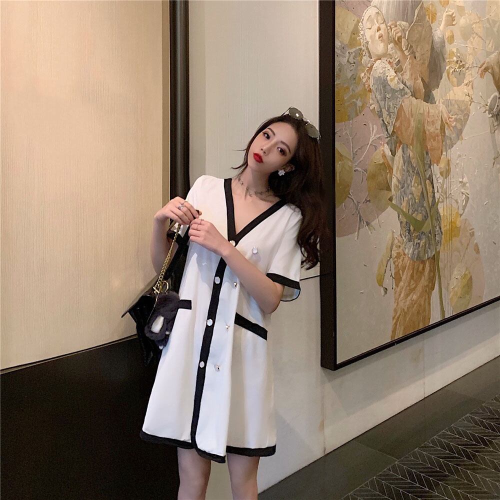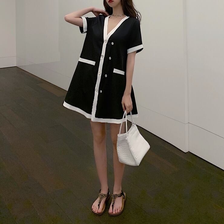 全2色 ワンピース 半袖 ひざ丈 Vネック ボタン ライン Aライン モノトーン カーディガン風 エレガント 上品 姫系 キャバ嬢 OL お呼ばれ カジュアル キレイめ 大人 フェミニン クラシカル 春 夏