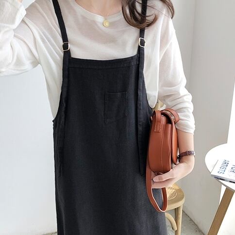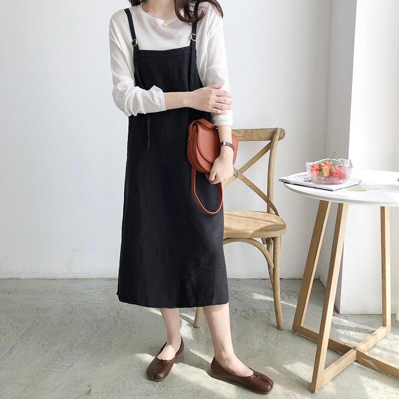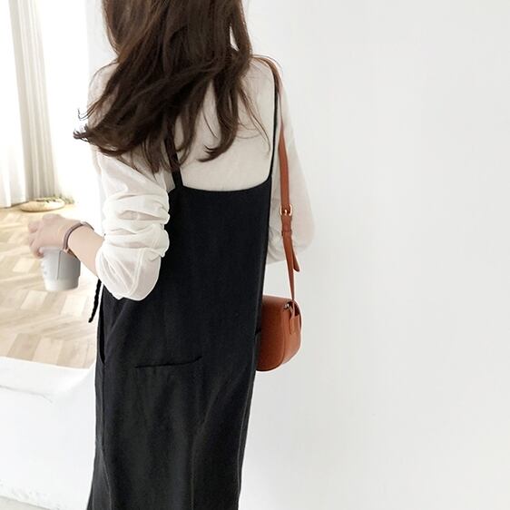 全2色 ワンピース ジャンパースカート ゆったり ポケット 肩紐 ストラップ ミディ丈 カジュアル 無地 シンプル ナチュラル 大人 レディース カワイイ 上品 春 夏 秋
