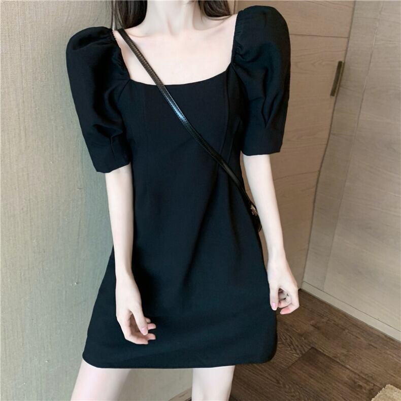 全2色 ワンピース ミニワンピ 無地 シンプル スクエアカラー パフスリーブ 5分袖 フレア Aライン 上品 ガーリー フェミニン エレガント カワイイ お出かけ デート 旅行 女子会 レディース