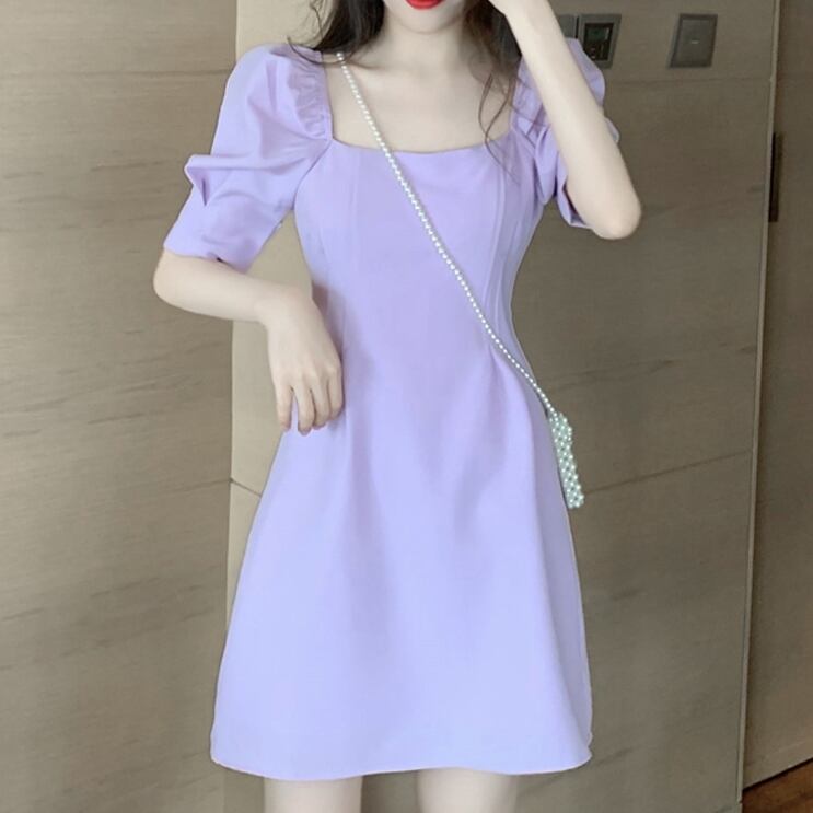 スクエアカラーでパフスリーブが可愛らしいワンピースは全体的に無地でシンプルな仕上がりですが