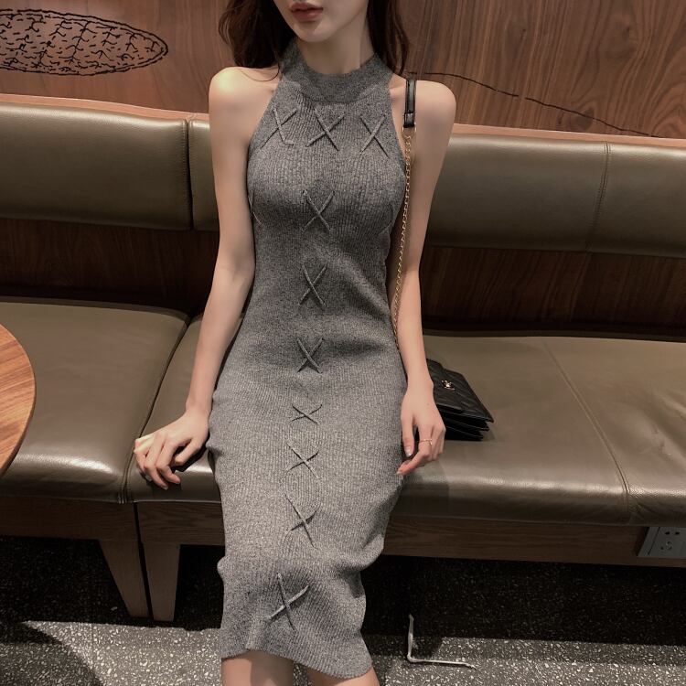 レースアップされたようなデザインになっていて、ボトルネックタイプのノースリーブワンピースになります。