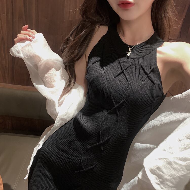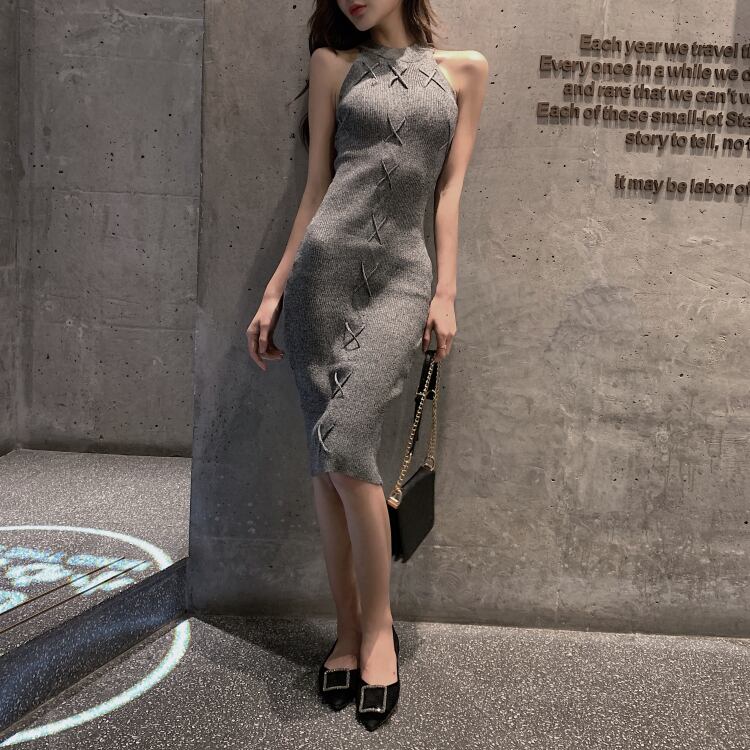 全3色 ワンピース リブ ネックスリーブ ノースリーブ レースアップ ミモレ丈 膝下 タイト スリム ワンピ 大人 レディース 女子会 お呼ばれ 春 夏 秋