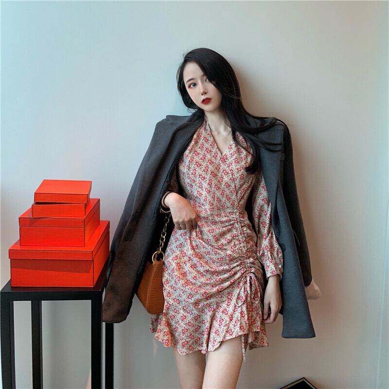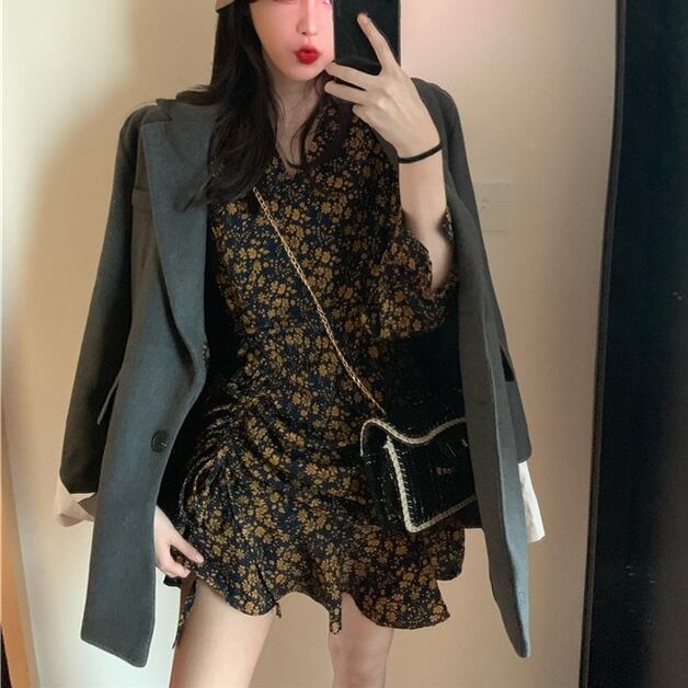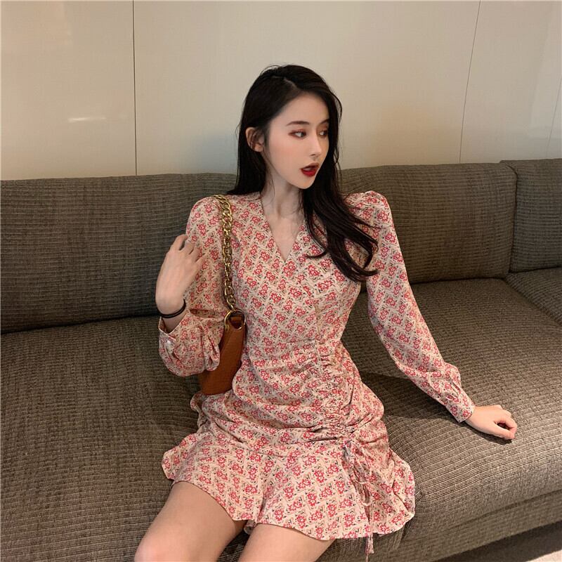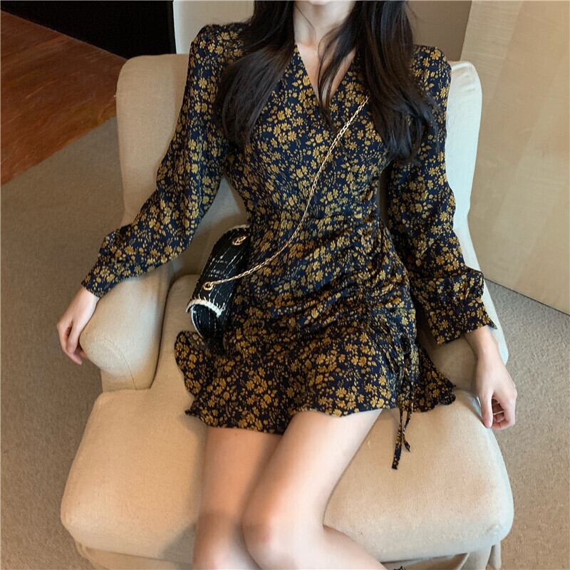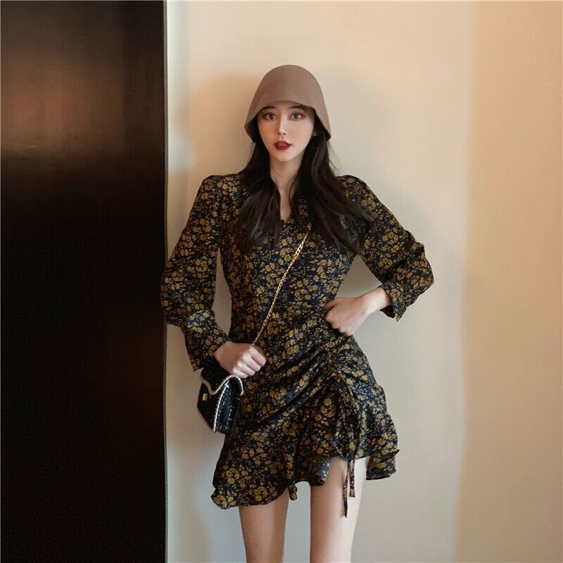 全2色 ワンピース 花柄 フラワー 長袖 ロングスリーブ Vネック フリル シャーリング アシンメトリー 膝上 ミニワンピ フリル Aライン エレガント 上品 大人 おしゃれ クラシカル レトロ ガーリー カワイイ 春 夏 秋