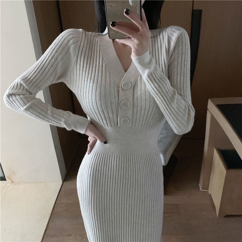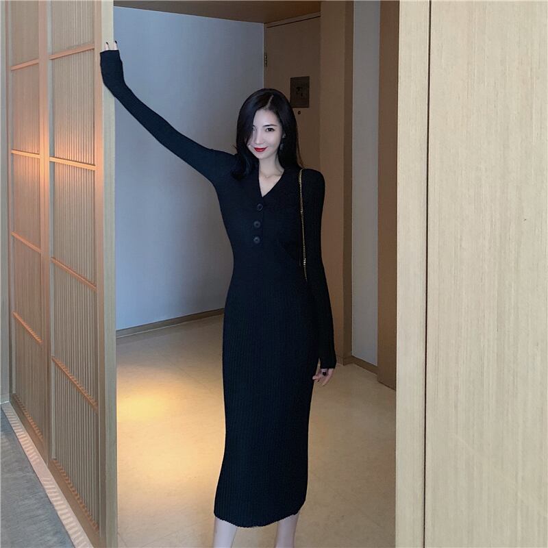 全2色 ワンピース ロングワンピ リブ ボタン Vネック 長袖 ロングスリーブ ハイウエスト 無地 シンプル エレガント 上品 カジュアル カワイイ 大人 レディース クラシカル お出かけ 女子会 デート OL 春 秋
