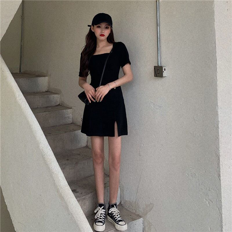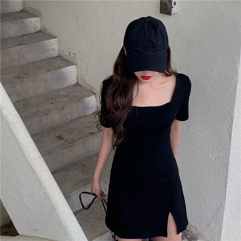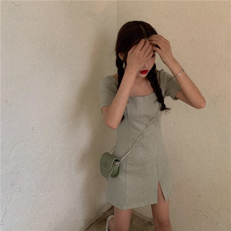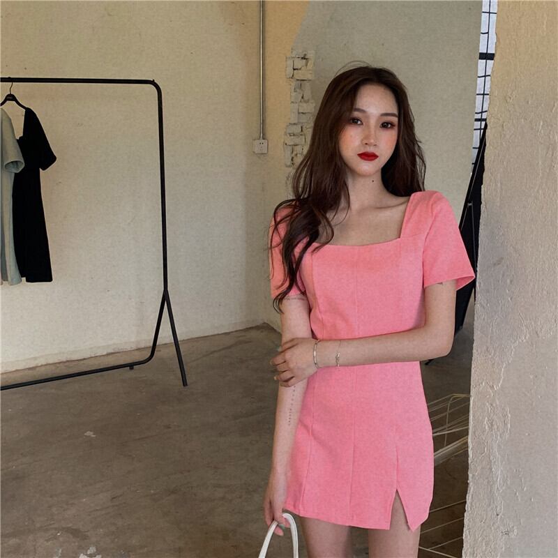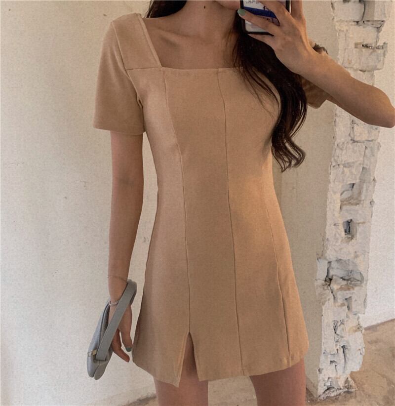 全4色 ワンピース ミニワンピ タイト スクエアカラー 無地 シンプル 半袖 タック スリット 伸縮性 カワイイ カジュアル ガーリー レトロ かっこいい 上品 エレガント ストリート 大人 お出かけ デート 女子会 レジャー 春 夏