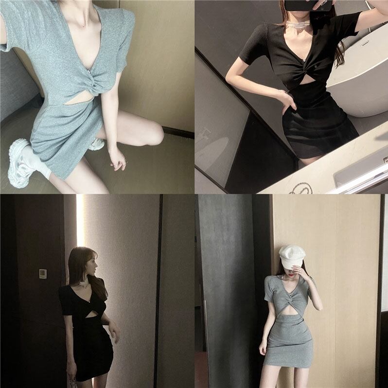 全2色 ワンピース タイト ウエスト開き Vネック 半袖 無地 シンプル セクシー デザイン ワンピ ツイストバスト カジュアル エレガント 上品 ストリート カワイイ 大人 レディース 春 夏 カットソー 生地 おしゃれ