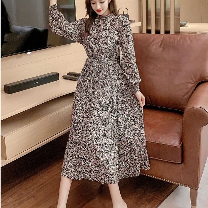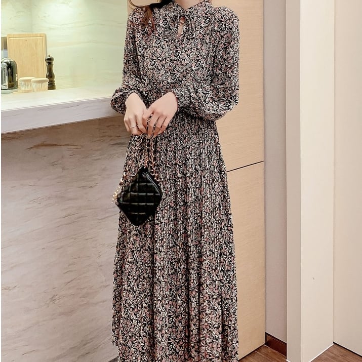 細かい小花柄のワンピースはシフォンでスカートがプリーツになっています。