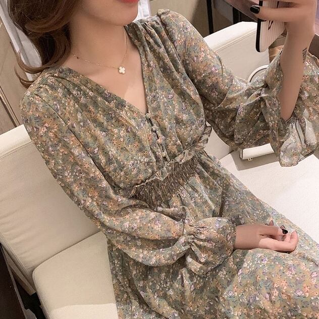全2色 ワンピース ロング ワンピ 花柄 フラワー 小花柄 Vネック ウエストゴム ハイウエスト ホーンスリーブ 長袖 シフォン ボタン アンティーク レトロ 大人 かわいい おしゃれ 上品 お呼ばれ お出かけ 女子会 春 秋
