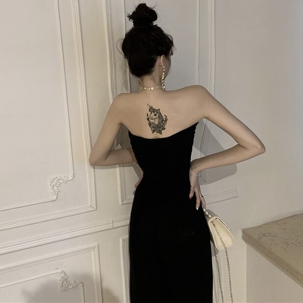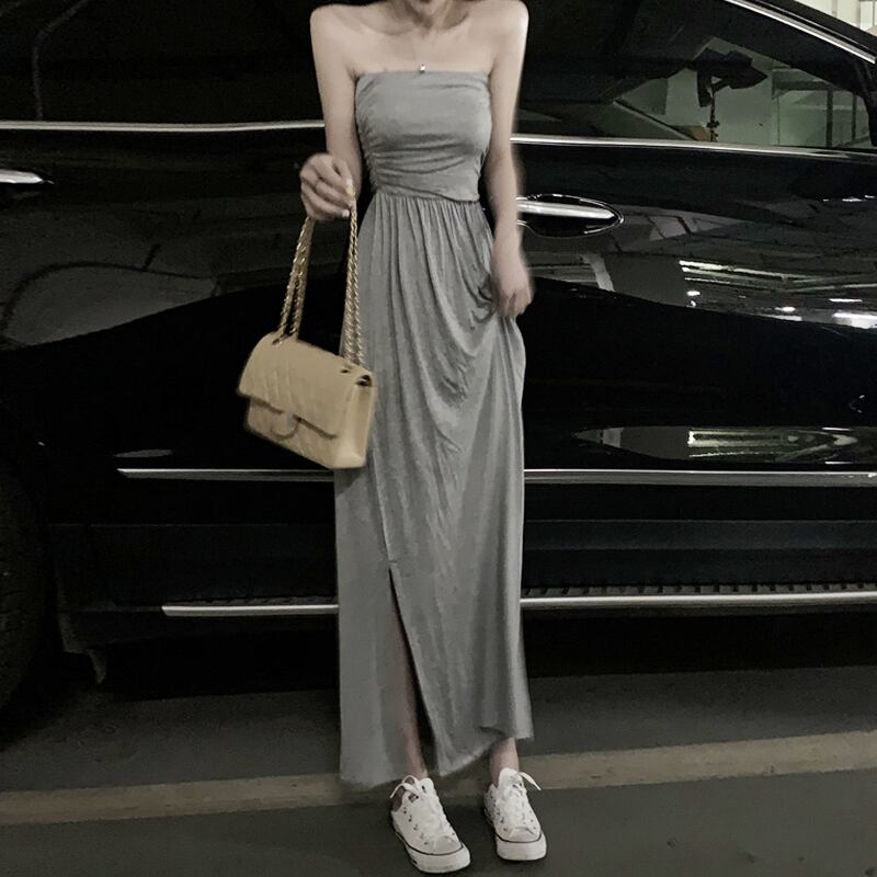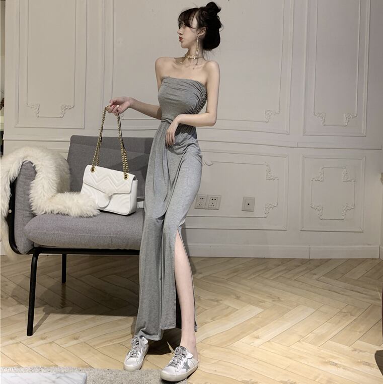 全2色 チューブトップ ベアトップ ワンピース ドレープ タック サイドスリット ハイウエスト ワンピ ロング丈 可愛い 大人可愛い レディース セクシー エレガント お出かけ 買い物 リゾート 旅行 デート パーティー お呼ばれ 女子会 夏