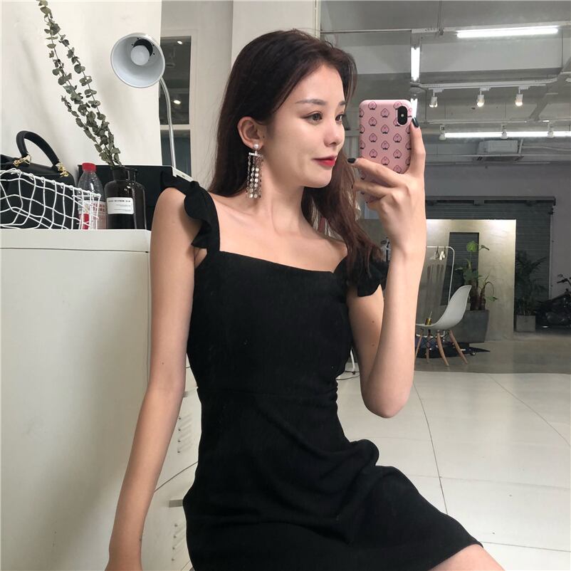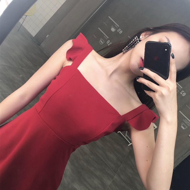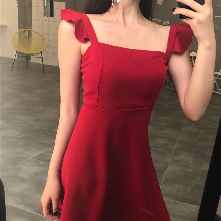 全2色 ワンピース スクエアカラー フリル 肩紐 タイト スリム 無地 シンプル ミニ ワンピ 膝上 セクシー 色気 大人 レディース フェミニン エレガント 上品 パーティー ドレス 春 夏