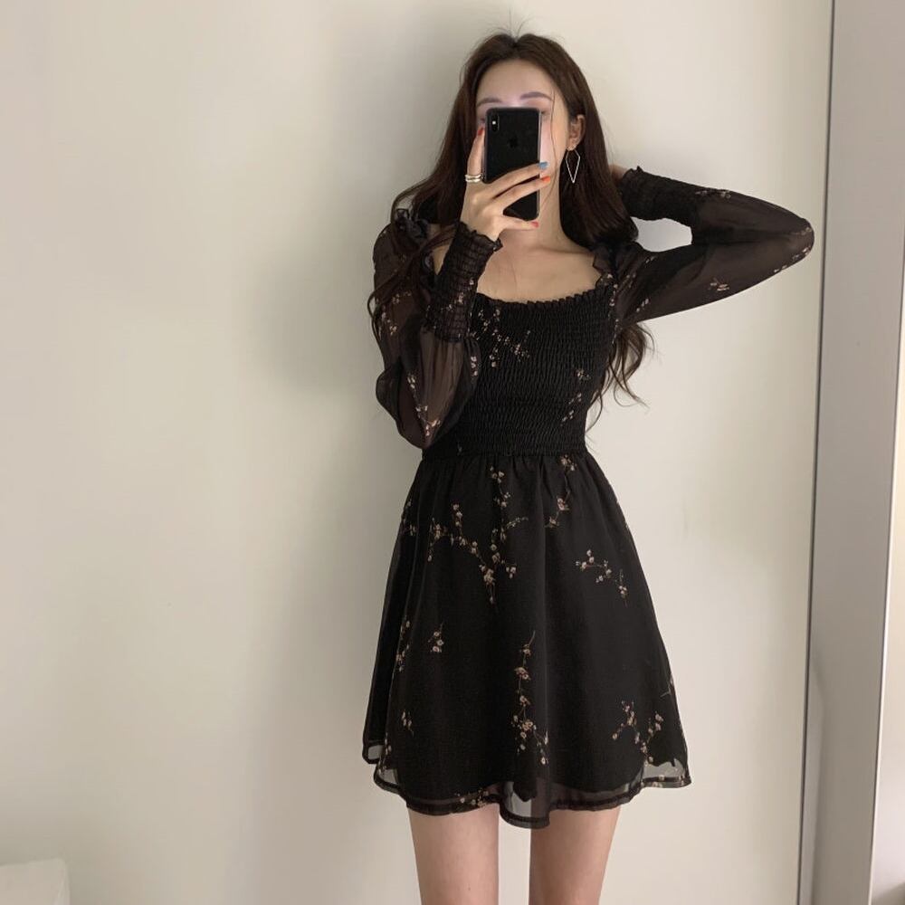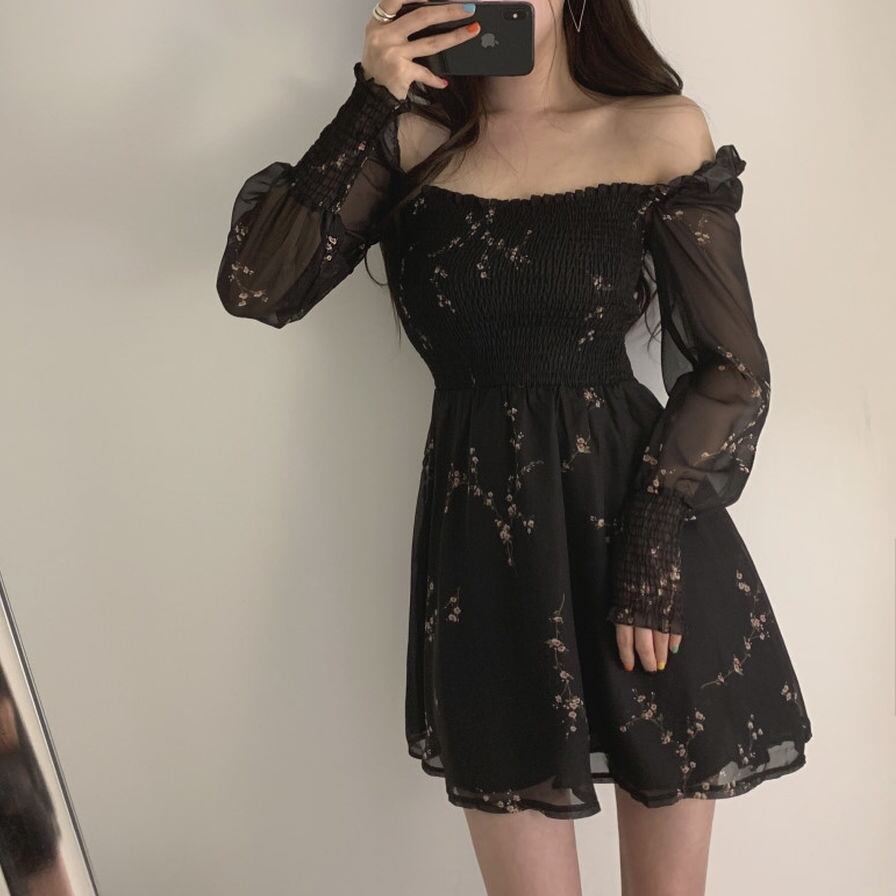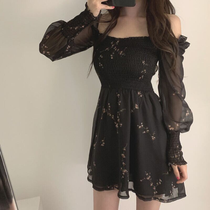 花柄 ワンピース シフォン 長袖 オフショル 2WAY フリル シースルー ミニ ワンピ Aライン ウエストゴム エレガント フェミニン レディース 女子 かわいい 大人 シック エレガント 春 夏 秋 ガーリー 膝上