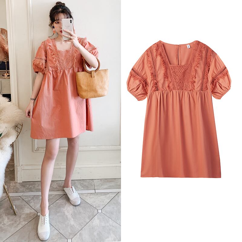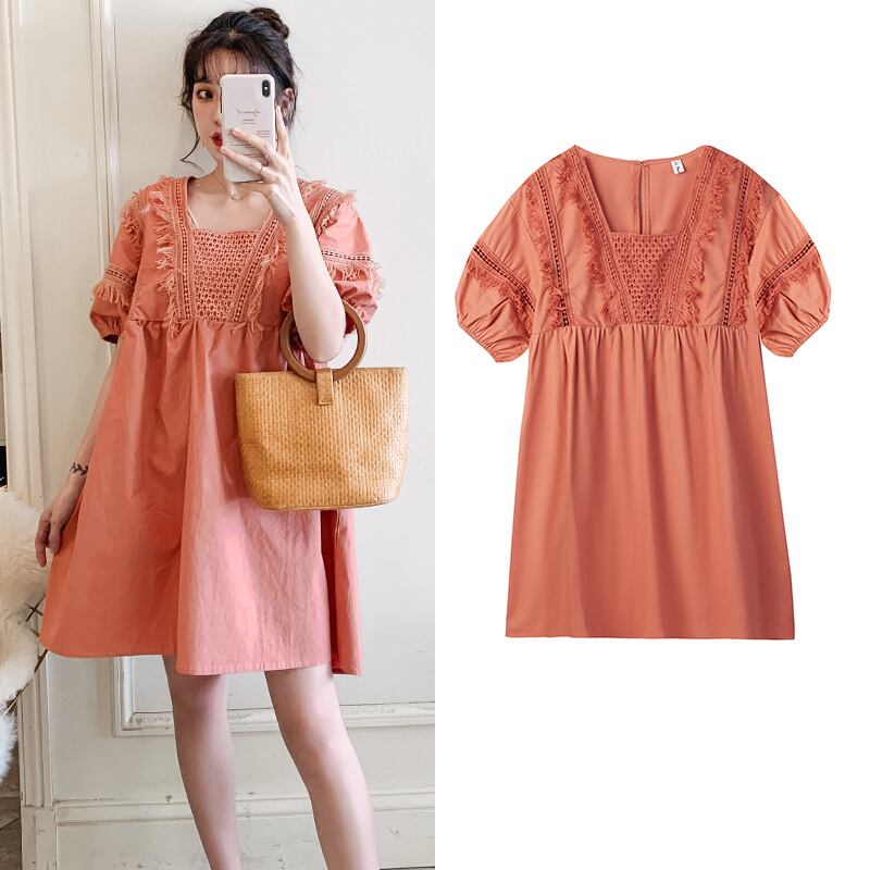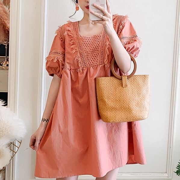 ワンピース フリル Aライン スクエアネック 半袖 パフスリーブ 膝上 エキゾチック エスニック アジア 民族系 フリンジ レース マタママ 妊婦 ママ 大きいサイズ プラスサイズ 春 夏