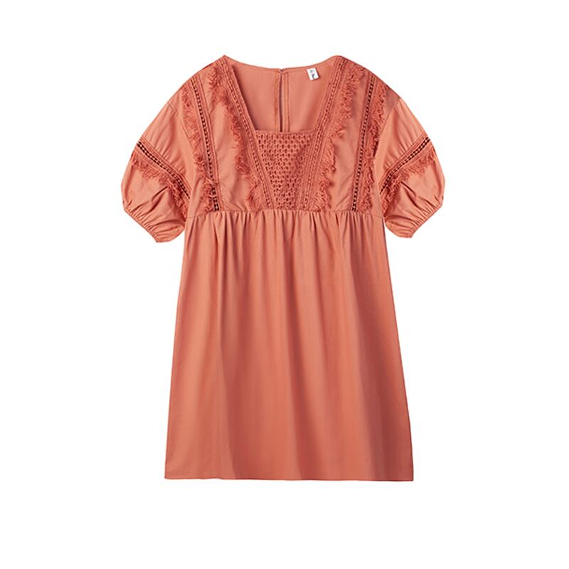フリンジとレースが施され、パフスリーブがかわいく、Aラインで体型カバーしてくれる