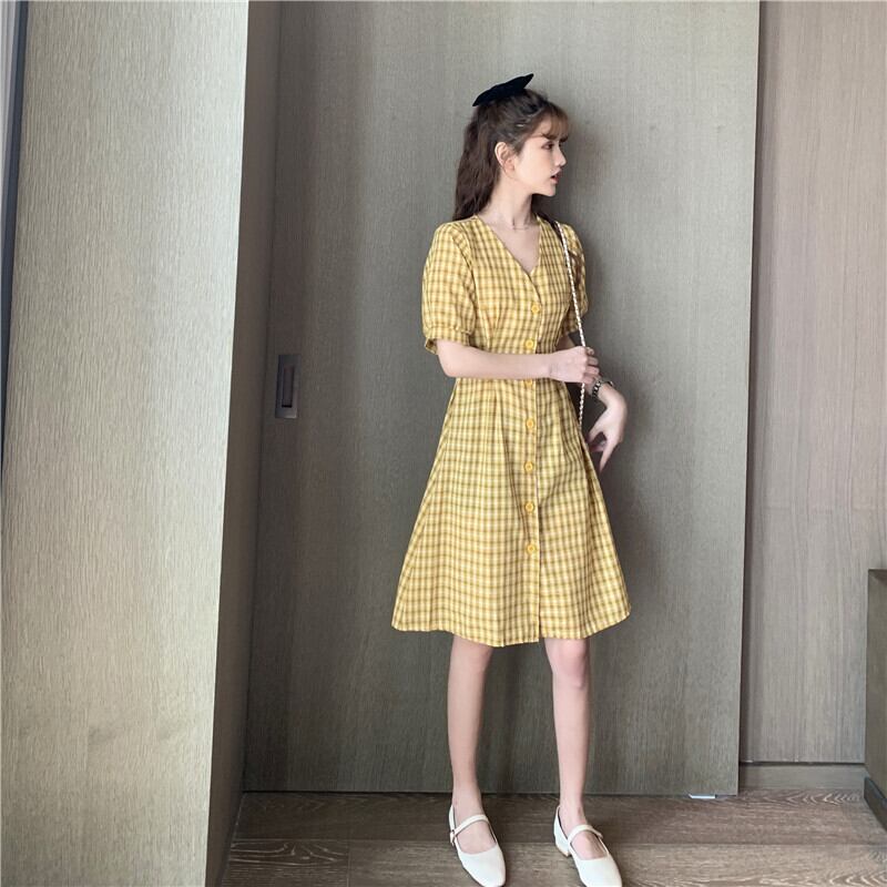全4色 チェック ワンピース Vネック ボタン 半袖 ランタンスリーブ ウエストシェイプ ひざ丈 レトロ かわいい 大人 ガーリー フェミニン お出掛け 女子会 デート お呼ばれ 旅行