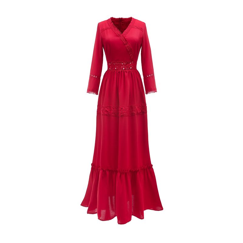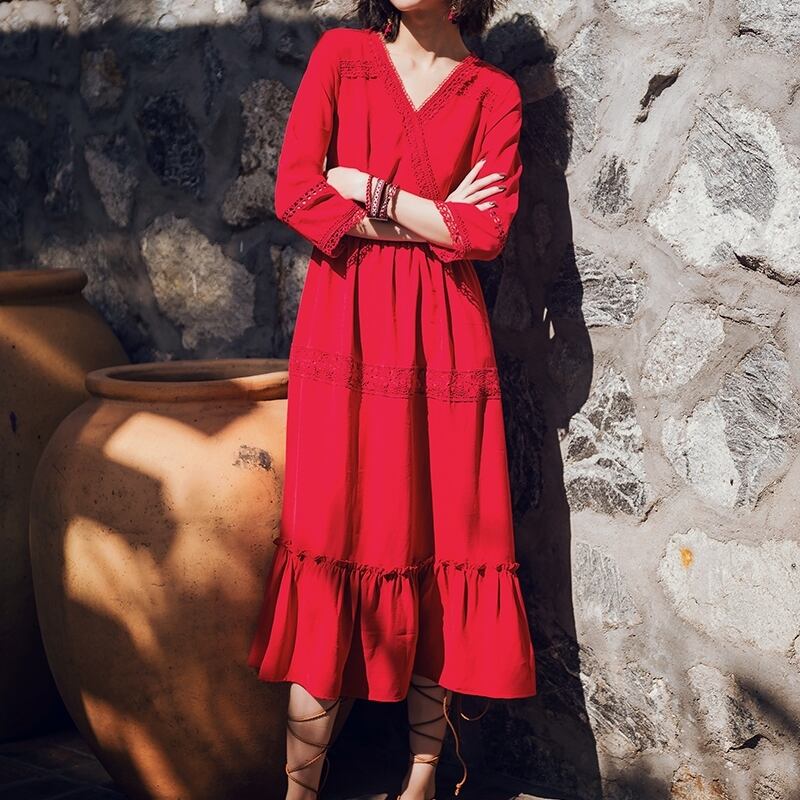 ワンピース 七分袖 エスニック 無地 シンプル 花柄 レース Vネック ティアード フレア Aライン 膝下 大人 かわいい リゾート 旅行 お呼ばれ フリル 春 夏 秋