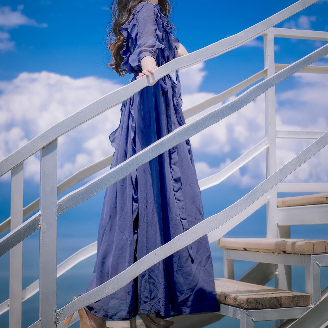 ラッフルフリルがフロントと袖に施され、ウエストシェイプがかかっている、