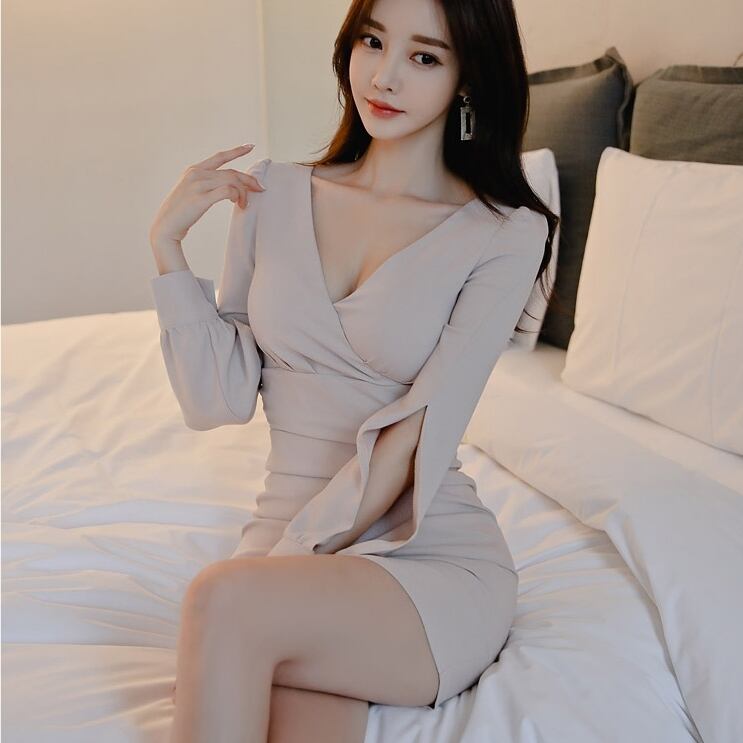 ワンピース Vネック 長袖 ロングスリーブ ミニ ワンピ 膝上 無地 ハイウエスト カフス 背中開き セクシー 無地 シンプル 大人 かわいい エレガント おしゃれ 上品 OL おでかけ 春 夏 秋