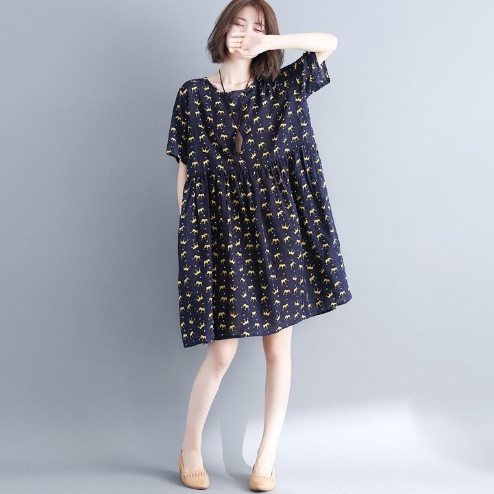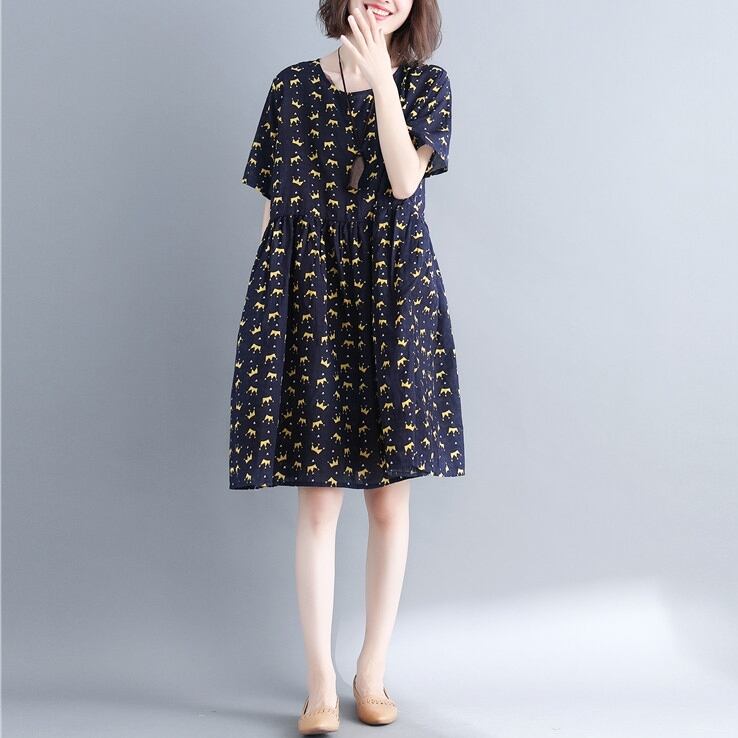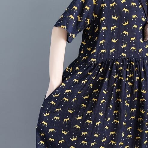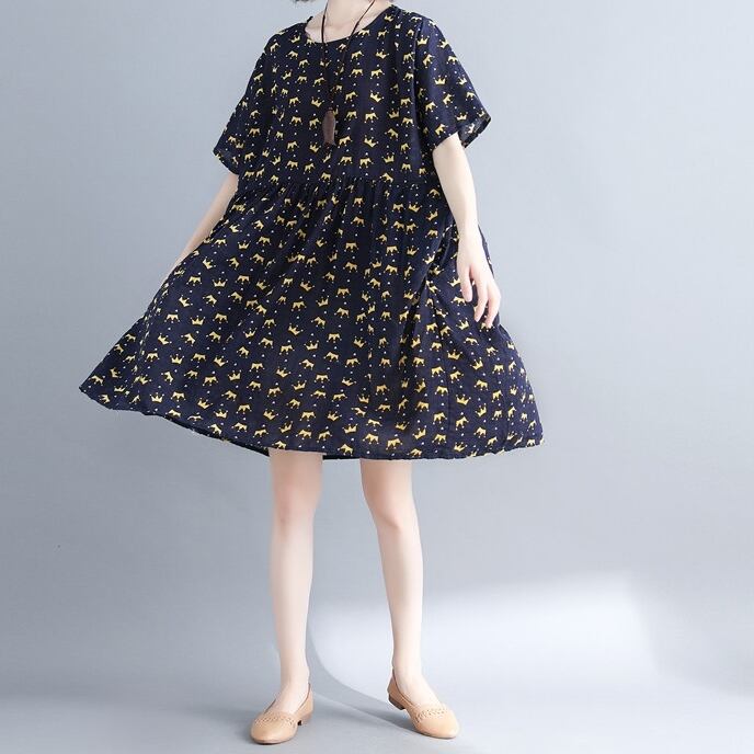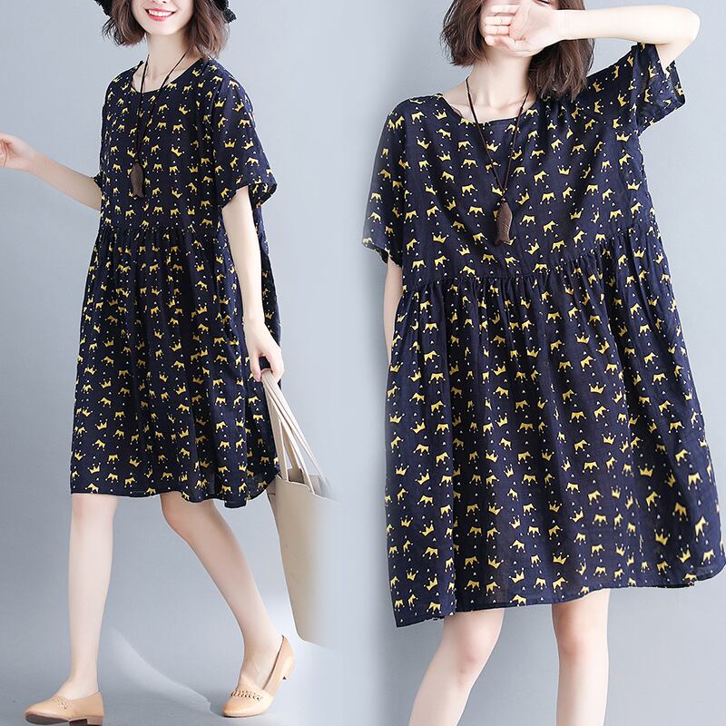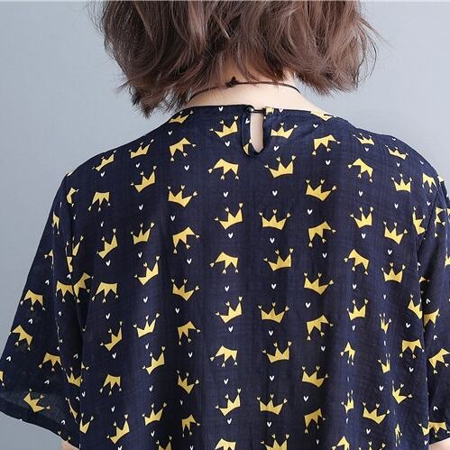 ワンピース 半袖 ひざ丈 ラウンドネック Aライン 半袖 コットン クラウン 王冠 妊婦 マタニティ ゆったり プラスサイズ 春 夏 ネイビー 紺 ガーリー 大人 かわいい カジュアル ポップ フェミニン
