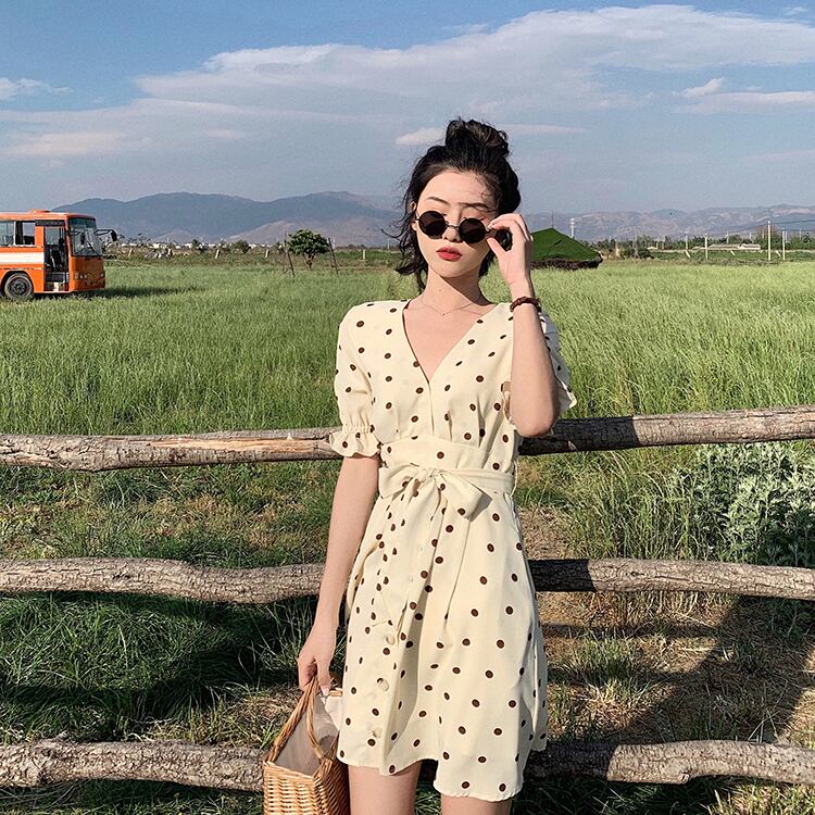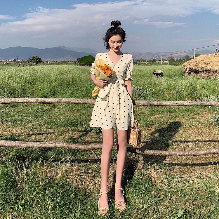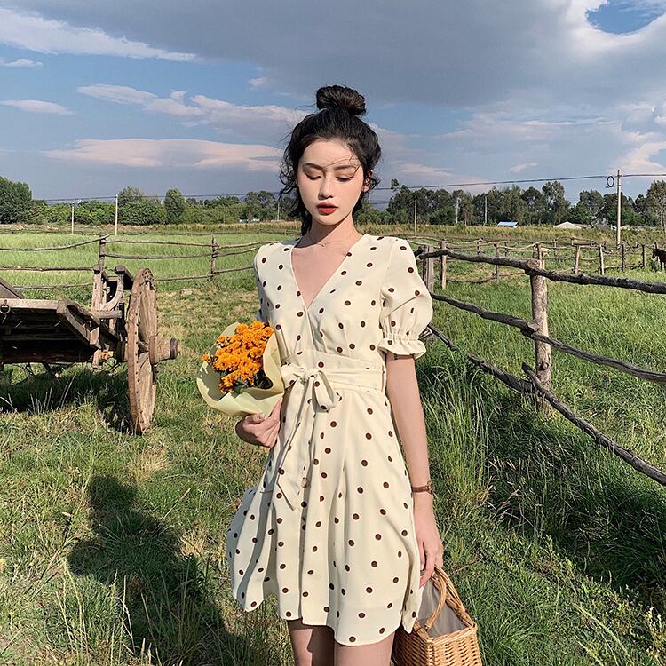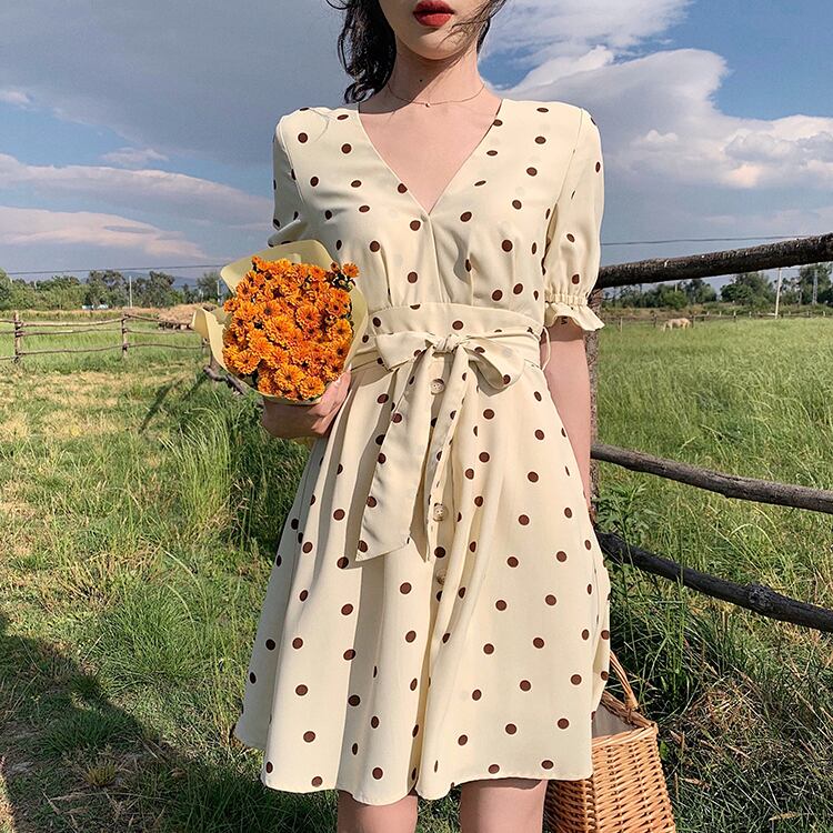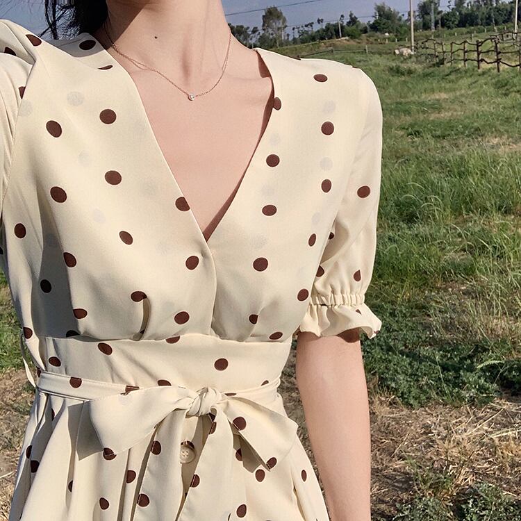 水玉 ドット カシュクール シフォンワンピース フレア Vネック フロントボタン 切り替え ウエストリボン ハイウエスト Aライン 半袖 パフスリーブ フリル袖 ワンピ ミニ丈 ショート丈 可愛い 大人可愛い レディース ガーリー レトロ フェミニン キュート 清楚 上品 お出かけ 通勤 買い物 リゾート 旅行 デート 女子会 夏