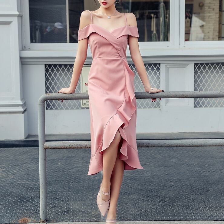 全2色 フリル ワンピース キャミ ワンピ オフショルダー ラッフル チューリップスカート Vネック ジップ スリング 肩紐 かわいい 大人 レディース 素敵 エレガント パーティー 二次会 姫系 フェミニン 春 夏