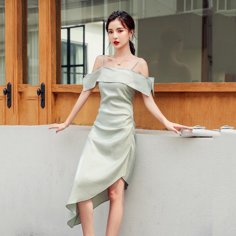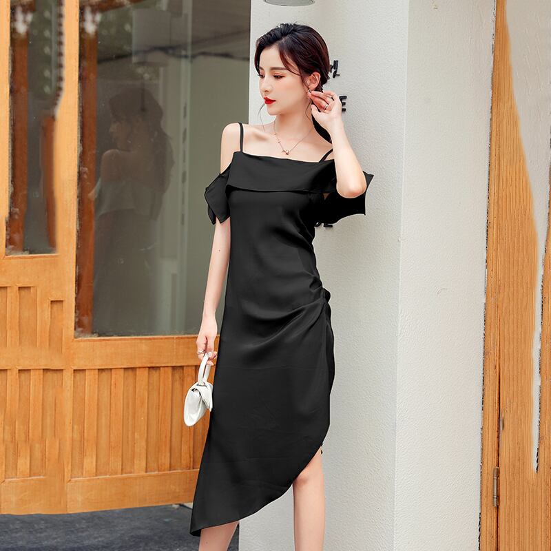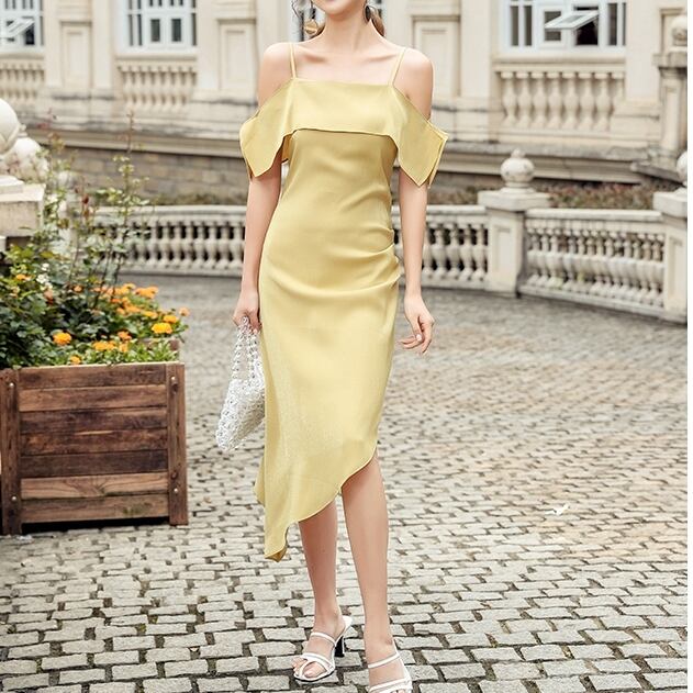 全4色 ワンピース アシンメトリー ミドル丈 肩紐 ストラップ オフショル スリング ドレス 無地 シンプル タイト スリム ナイトドレス パーティー おしゃれ 大人 エレガント フェミニン セレブ お出掛け リゾート 春 夏