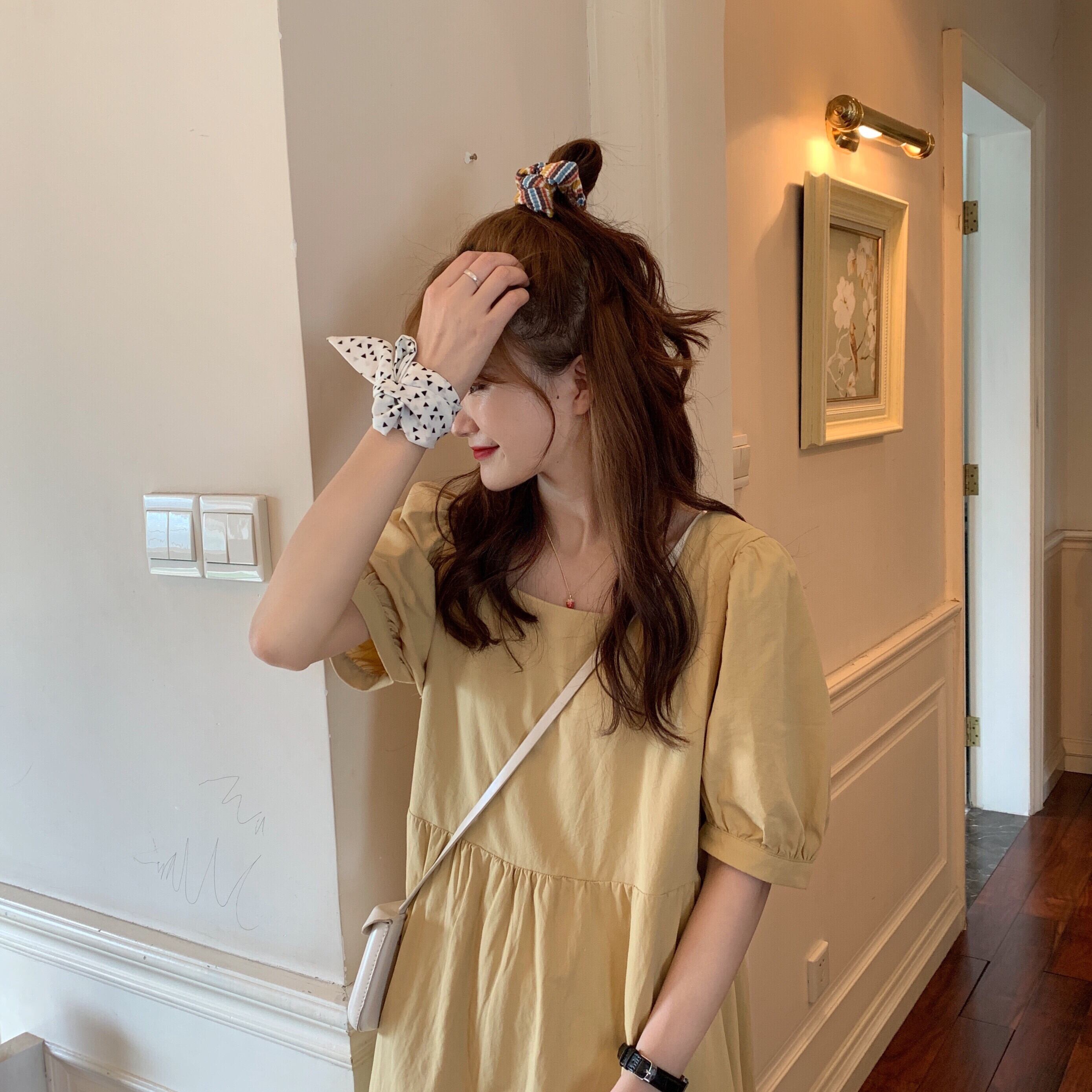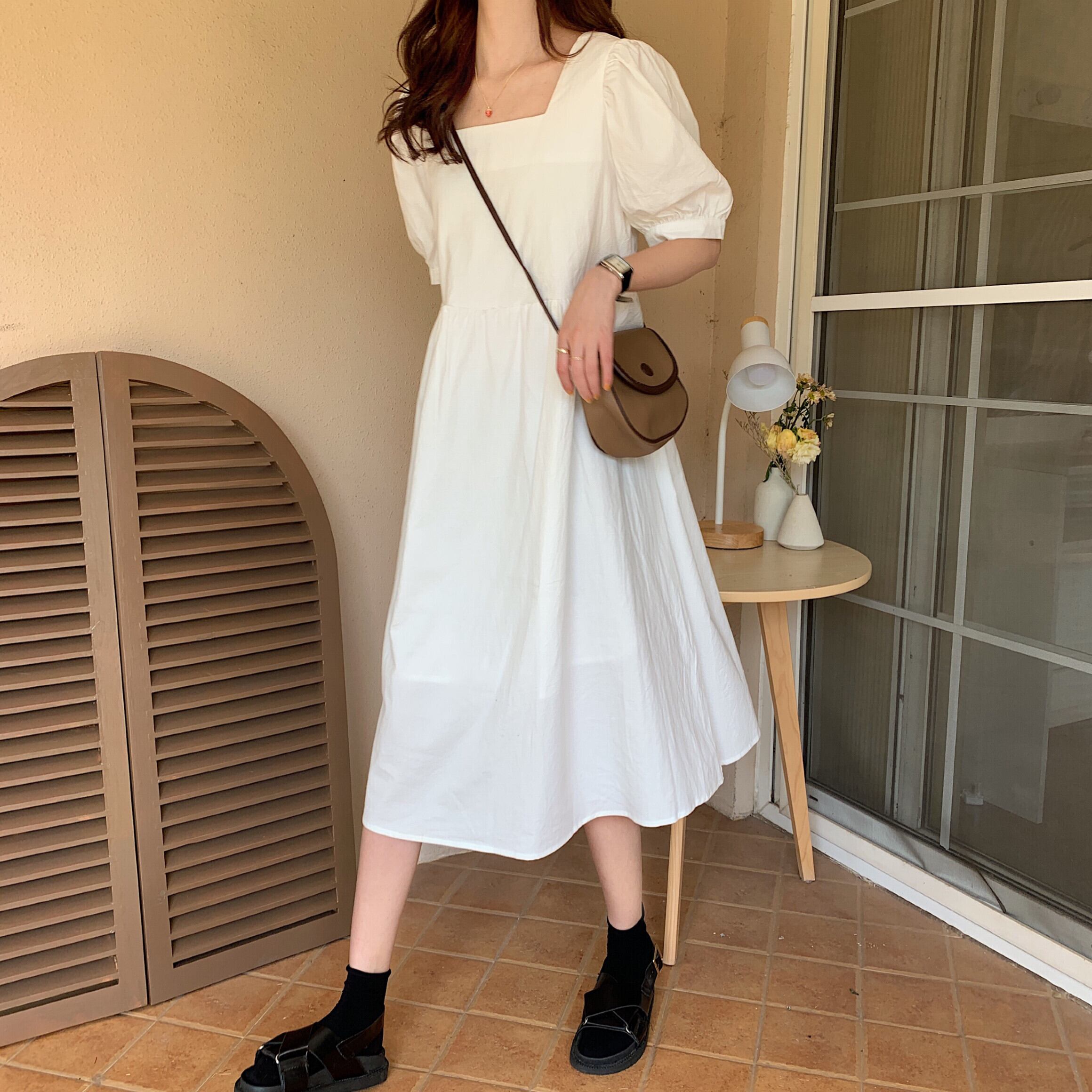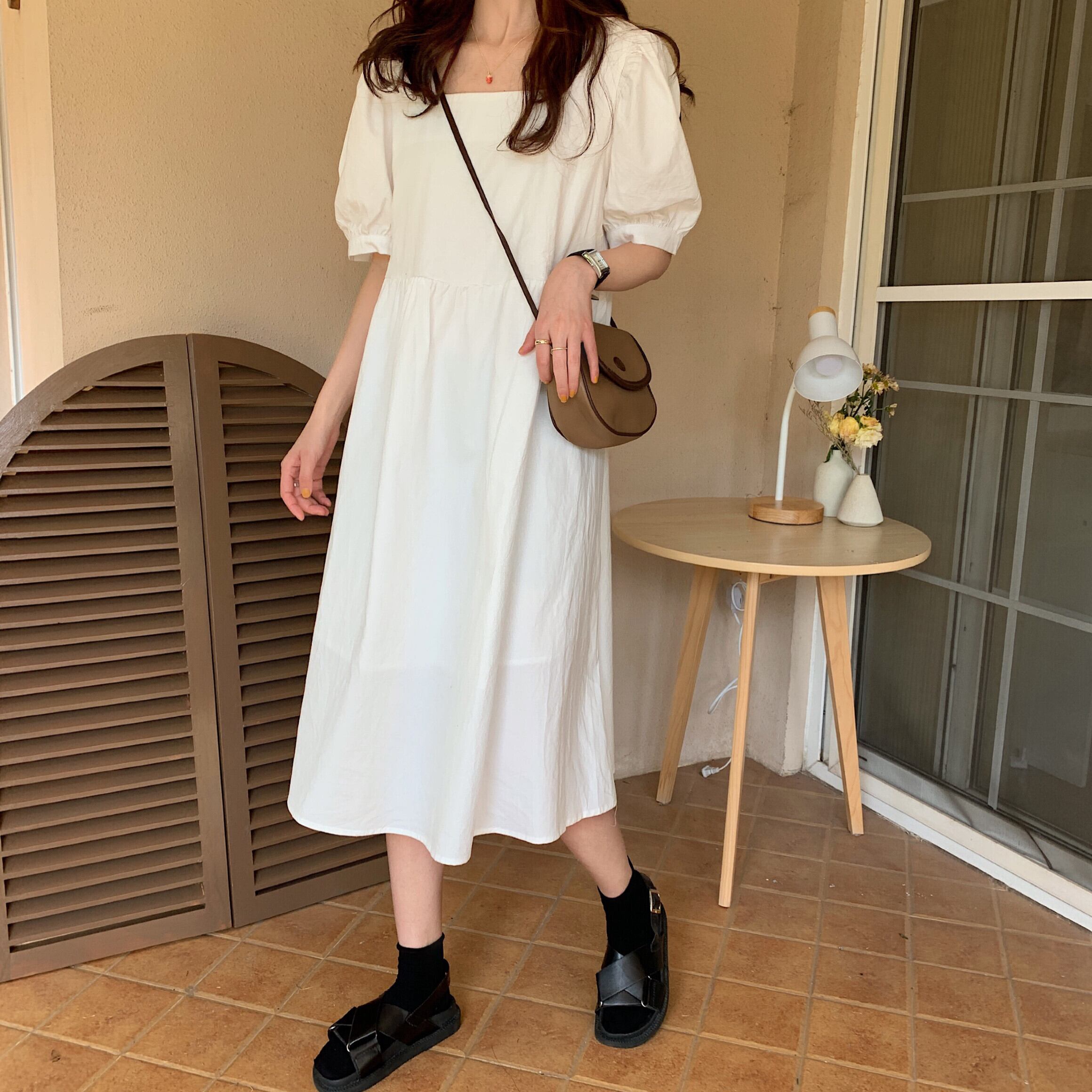 全3色 無地 スクエアネック ワンピース フレア パフスリーブ ハイウエスト Aライン 半袖 ワンピ ミモレ丈 可愛い 大人可愛い レディース ガーリー レトロ 森ガール キュート お出かけ 通勤 買い物 デート 女子会 夏