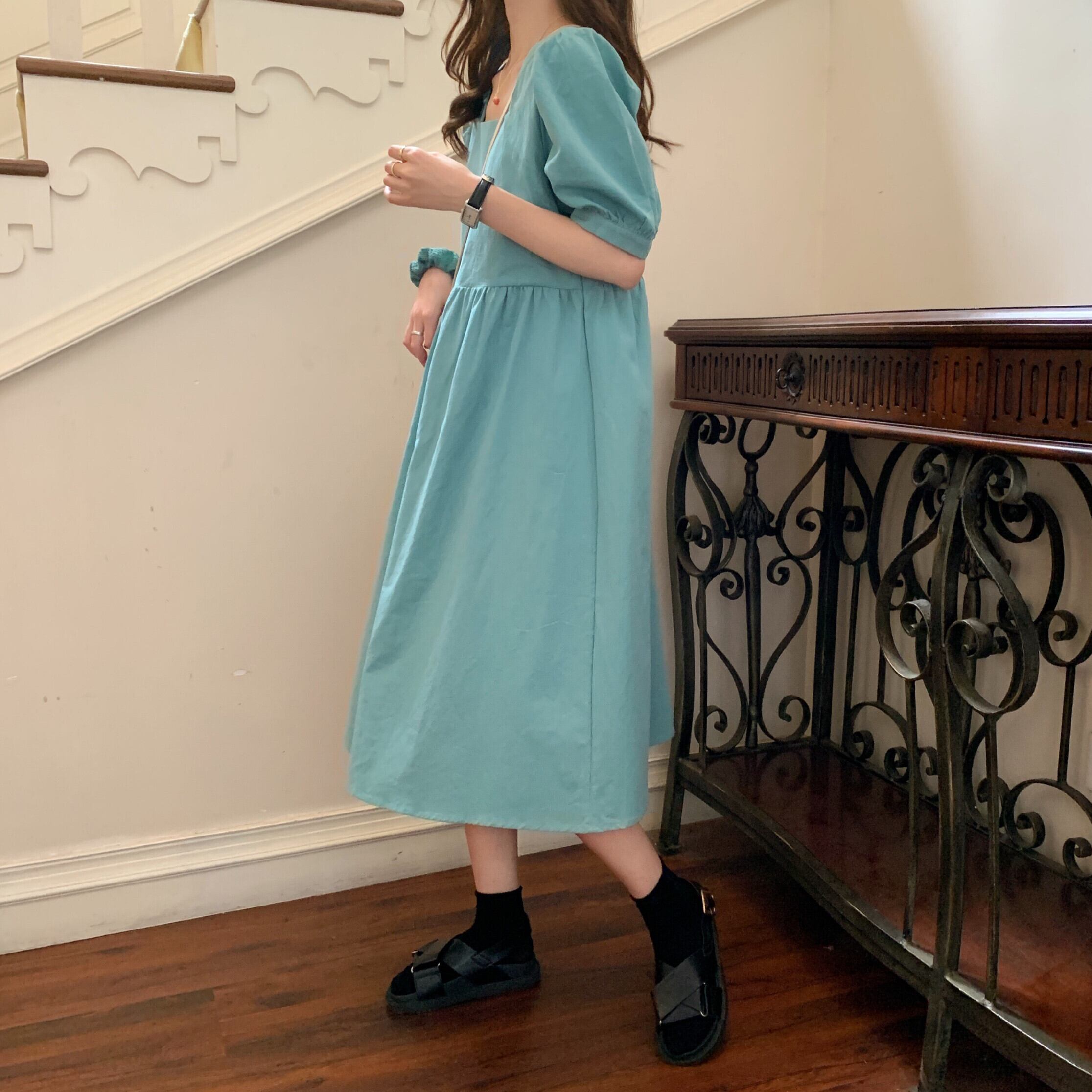 スクエアネックデザインのミモレ丈ワンピース♪