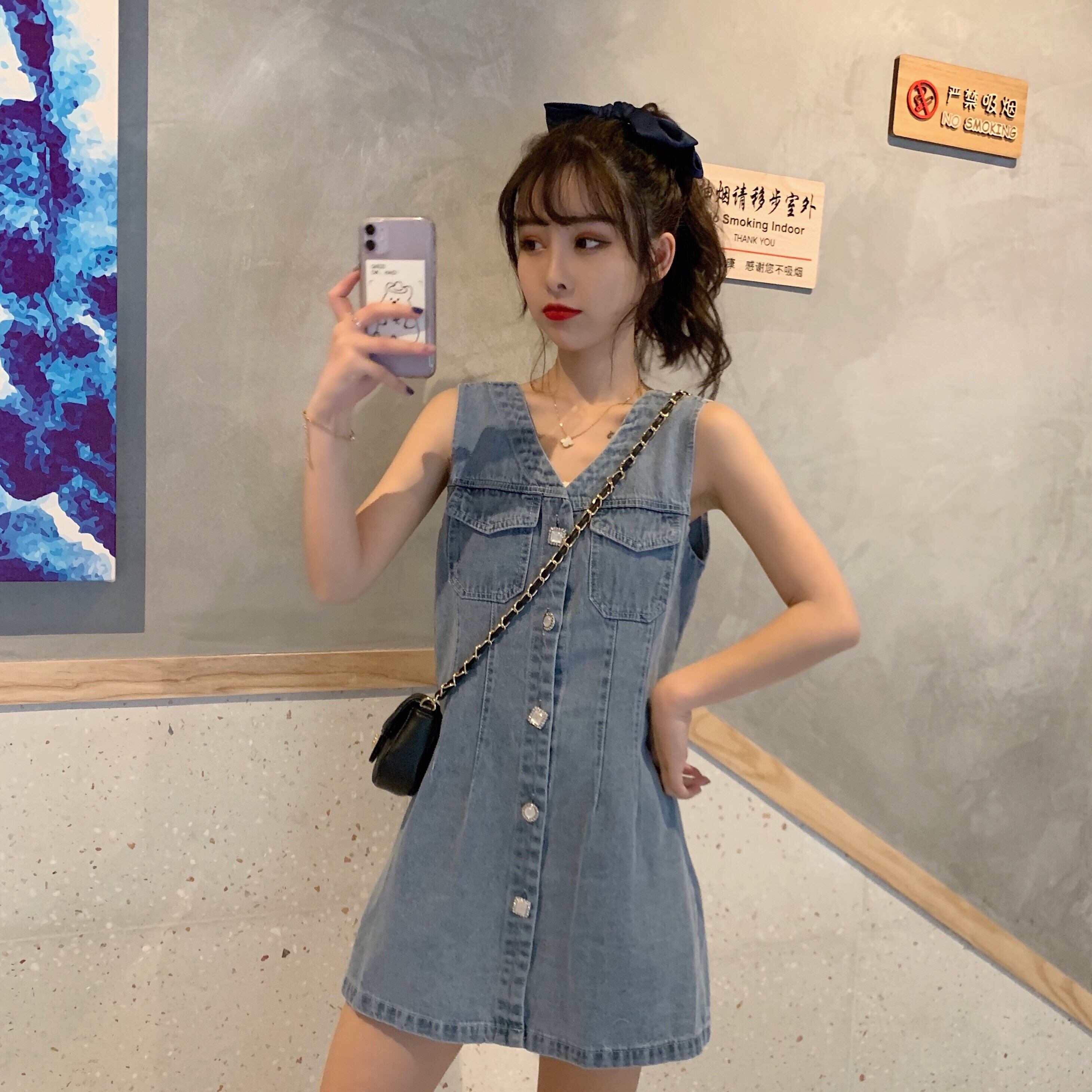 デニム ワンピース Vネック フロントボタン ハイウエスト ノースリーブ ワンピ ミニ丈 ショート丈 可愛い 大人可愛い レディース カジュアル ガーリー レトロ フェミニン キュート お出かけ 通勤 買い物 デート 女子会 夏