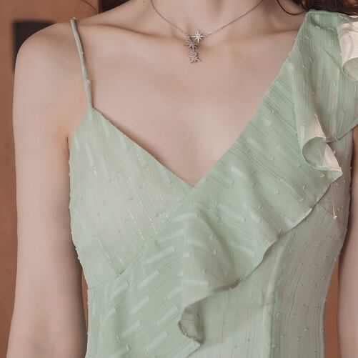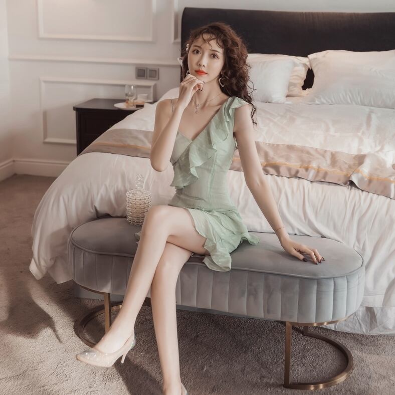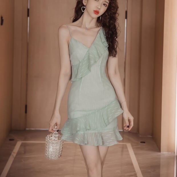 ワンピース フリル ミニ ワンピ アシンメトリー ワンショルダー スリング 肩紐 タイト スリム 段フリル Vネック 無地 パーティー 旅行 デート フェアリー かわいい 上品 レディース 大人 エレガント 春 夏