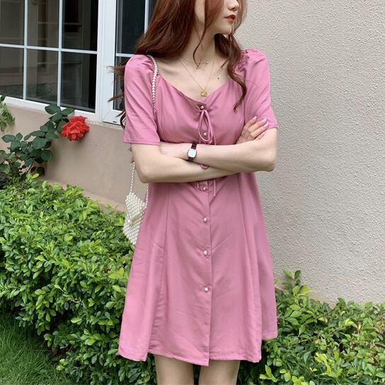 ワンピース リボン フレア Vネック フロントボタン ハイウエスト Aライン 半袖 ワンピ ショート丈 ミニ丈 可愛い 大人可愛い レディース ガーリー レトロ フェミニン キュート くすみカラー お出かけ 通勤 買い物 旅行 デート 女子会 夏