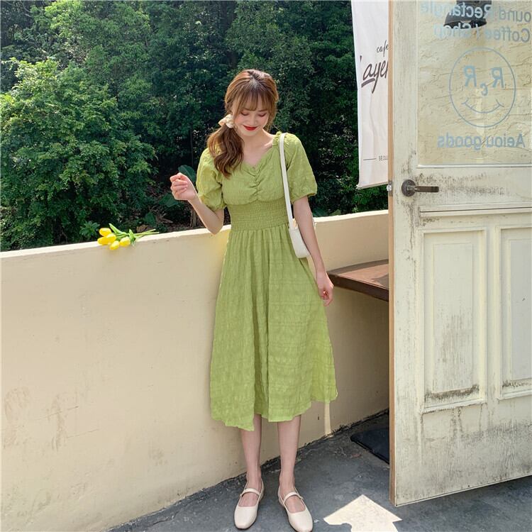 全2色 ワンピース ミモレ丈 半袖 Vネック ギャザー タック ワッフル ウエストゴム フェミニン レディース 大人 かわいい エレガント 清楚 姫系 上品 春 夏