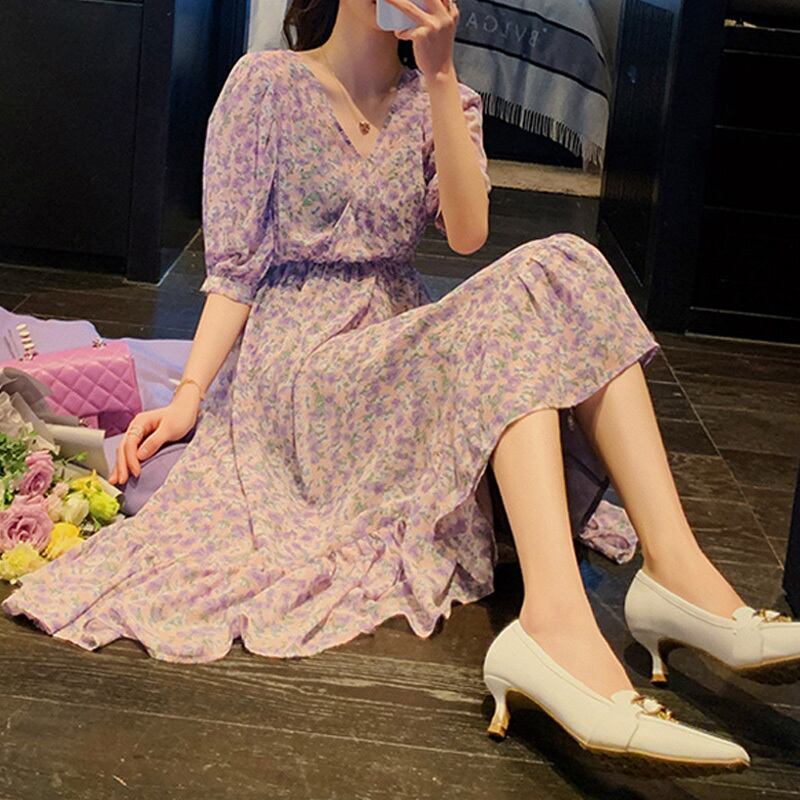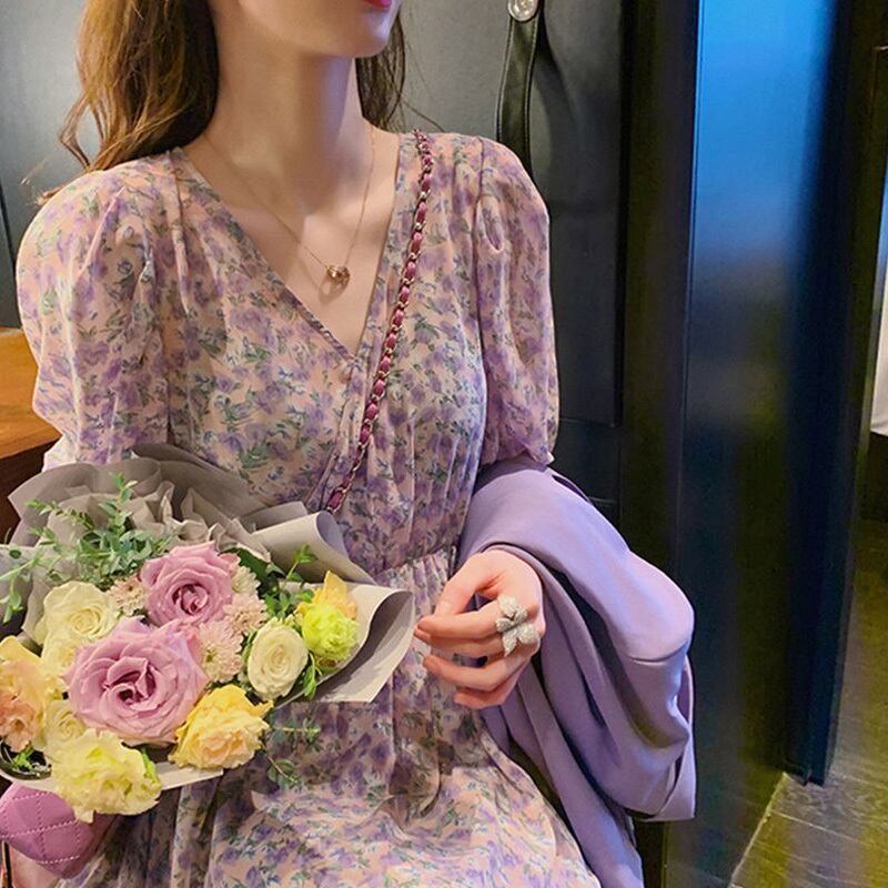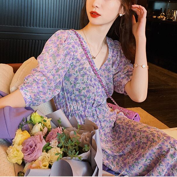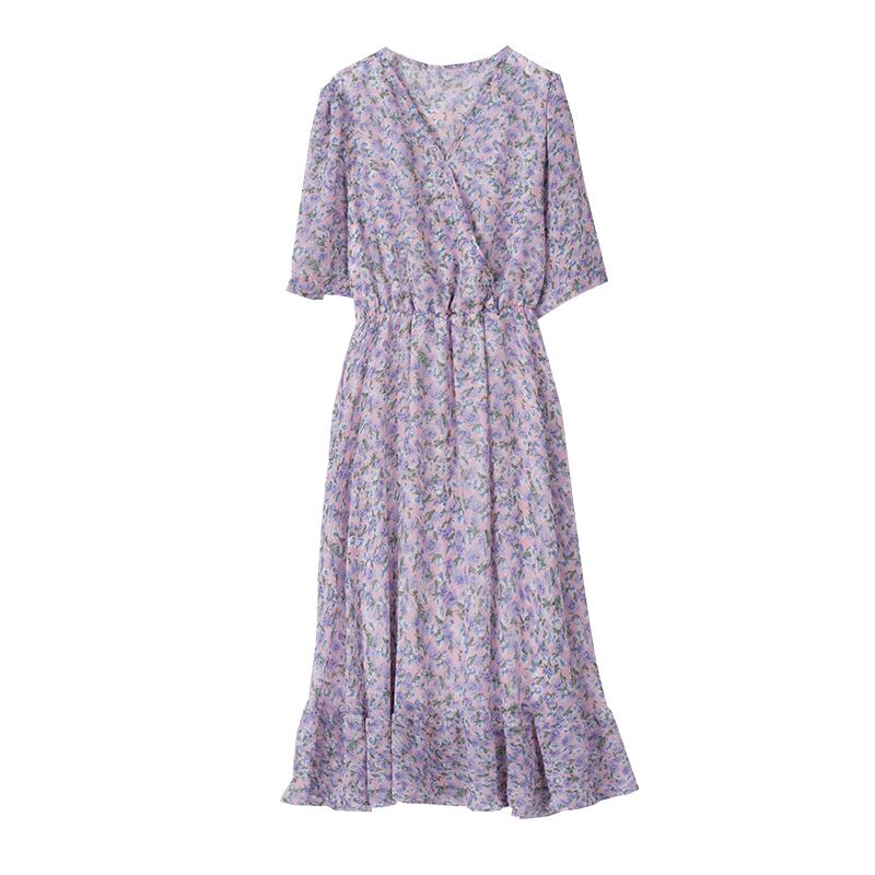 小花柄 カシュクールワンピース シフォン 裾フリル フレア Vネック ウエストゴム ハイウエスト Aライン 半袖 ワンピ ミモレ丈 可愛い 大人可愛い レディース ガーリー レトロ フェミニン キュート 清楚 上品 お出かけ 通勤 買い物 リゾート 旅行 デート 女子会 大きいサイズ 夏