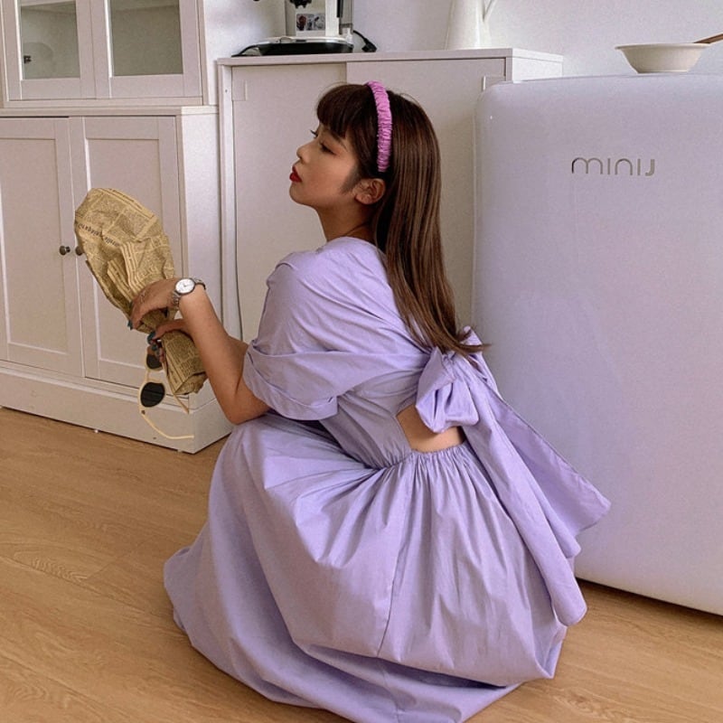 全3色 ワンピース 背中開き リボン 無地 2WAY ウエストゴム ロング ワンピ アレンジ おしゃれ 大人 カジュアル シンプル レディース かわいい 上品 エレガント シック クラシカル 春 夏 Aライン