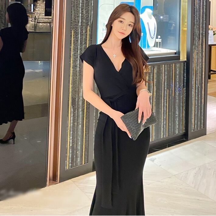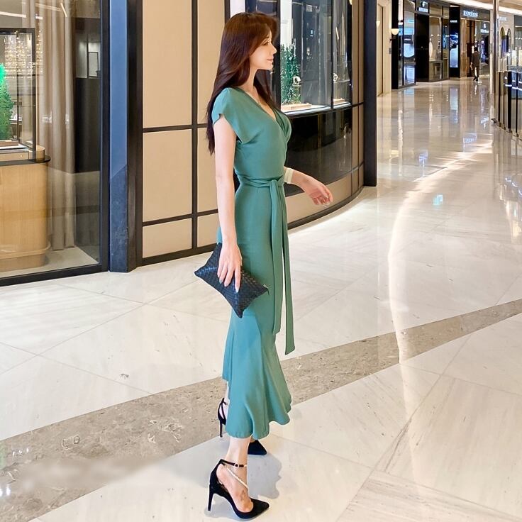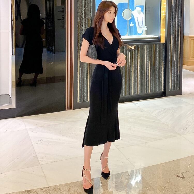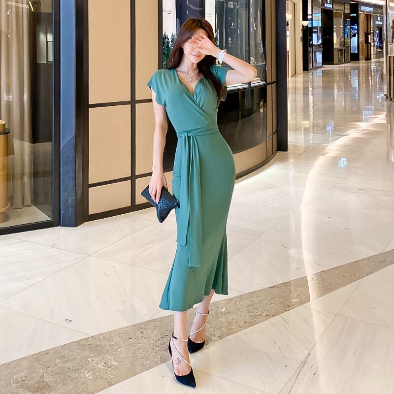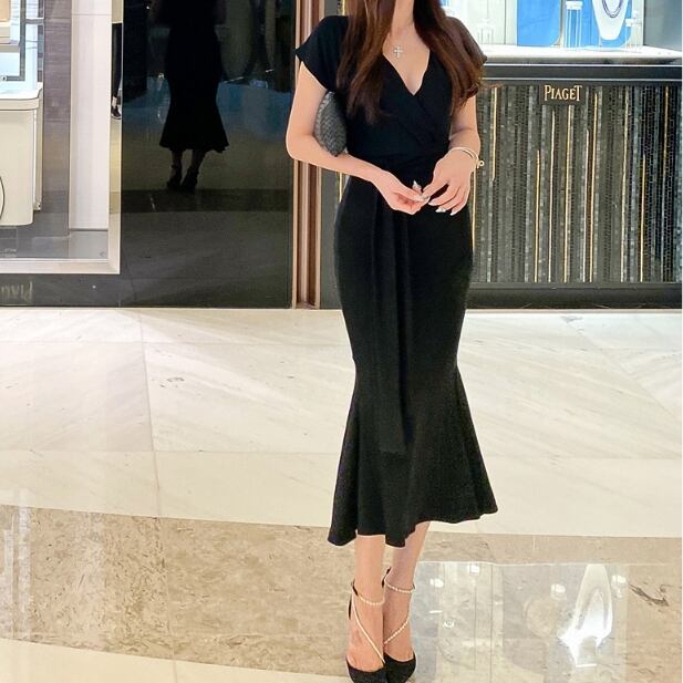 全2色 ワンピース ロング Vネック ワンピ ウエストマーク マーメイド 半袖 無地 シンプル フィッシュテール タイト セレブ 大人 レディース エレガント シック クラシカル 上品 お呼ばれ パーティー デート 春 夏