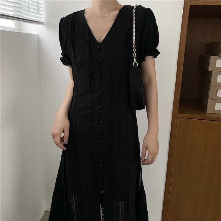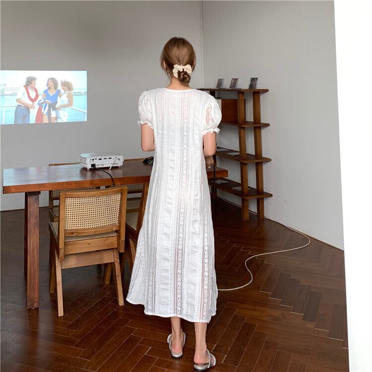 全2色 刺繍 レース ワンピース Vネック フロントボタン ハイウエスト Aライン 半袖 パフスリーブ ワンピ ロング丈 可愛い 大人可愛い レディース ガーリー レトロ フェミニン キュート 清楚 上品 お出かけ 通勤 買い物 リゾート 旅行 デート 女子会 夏